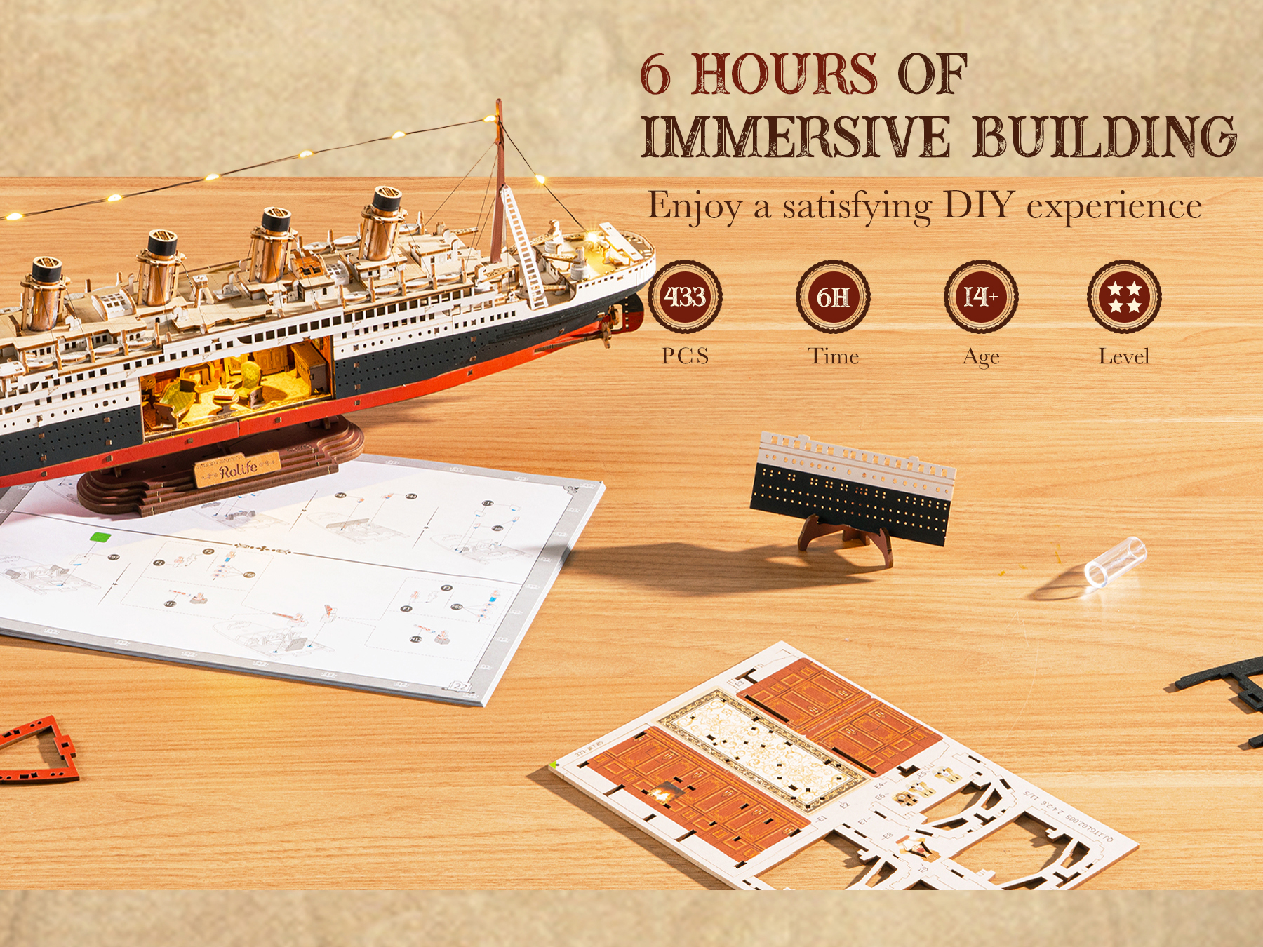 【Precision Engineering, Easy Assembly Without Glue】This model kit contains 433 precision laser-cut wooden parts that can be securely assembled without glue. Smooth, burr-free parts and clear instructions guide you through a challenging yet captivating 8-12 hour assembly experience.