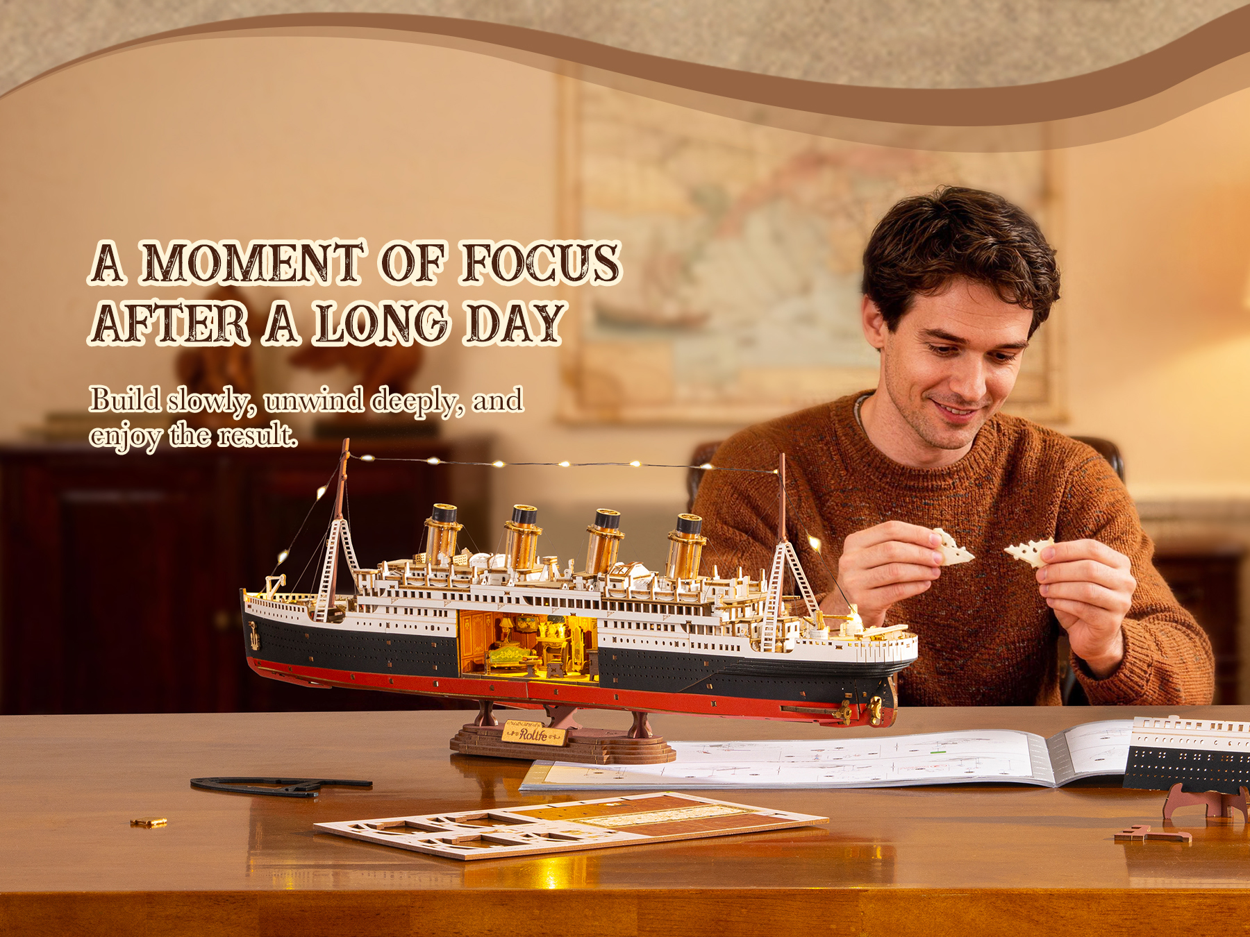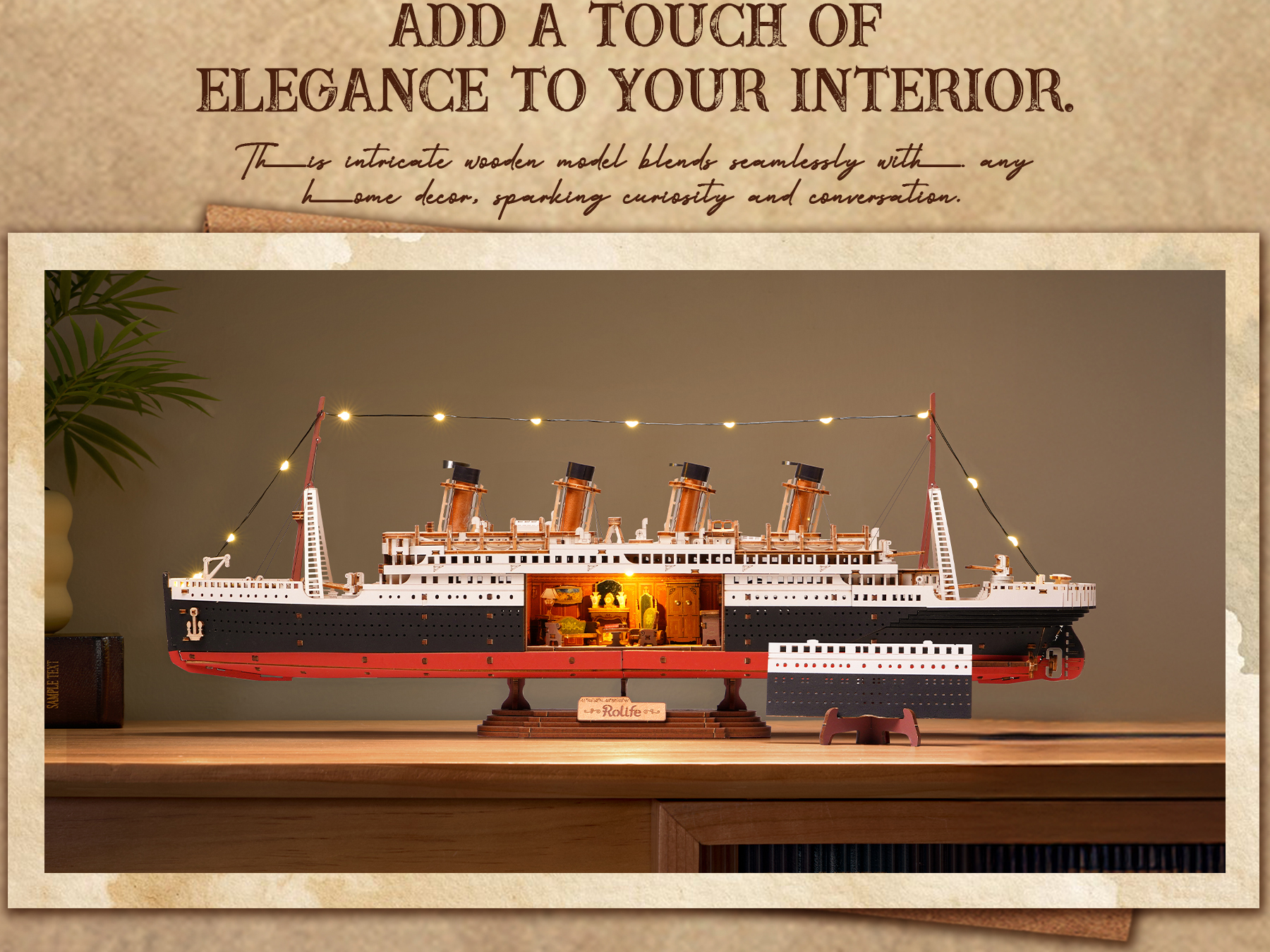【Warm-Toned LED Interior Lighting】The built-in LED lighting system illuminates the exquisite interior, emitting a warm glow and highlighting the model's intricate details. Once assembled, it will become a striking decorative piece, adding a touch of historical elegance to any room.