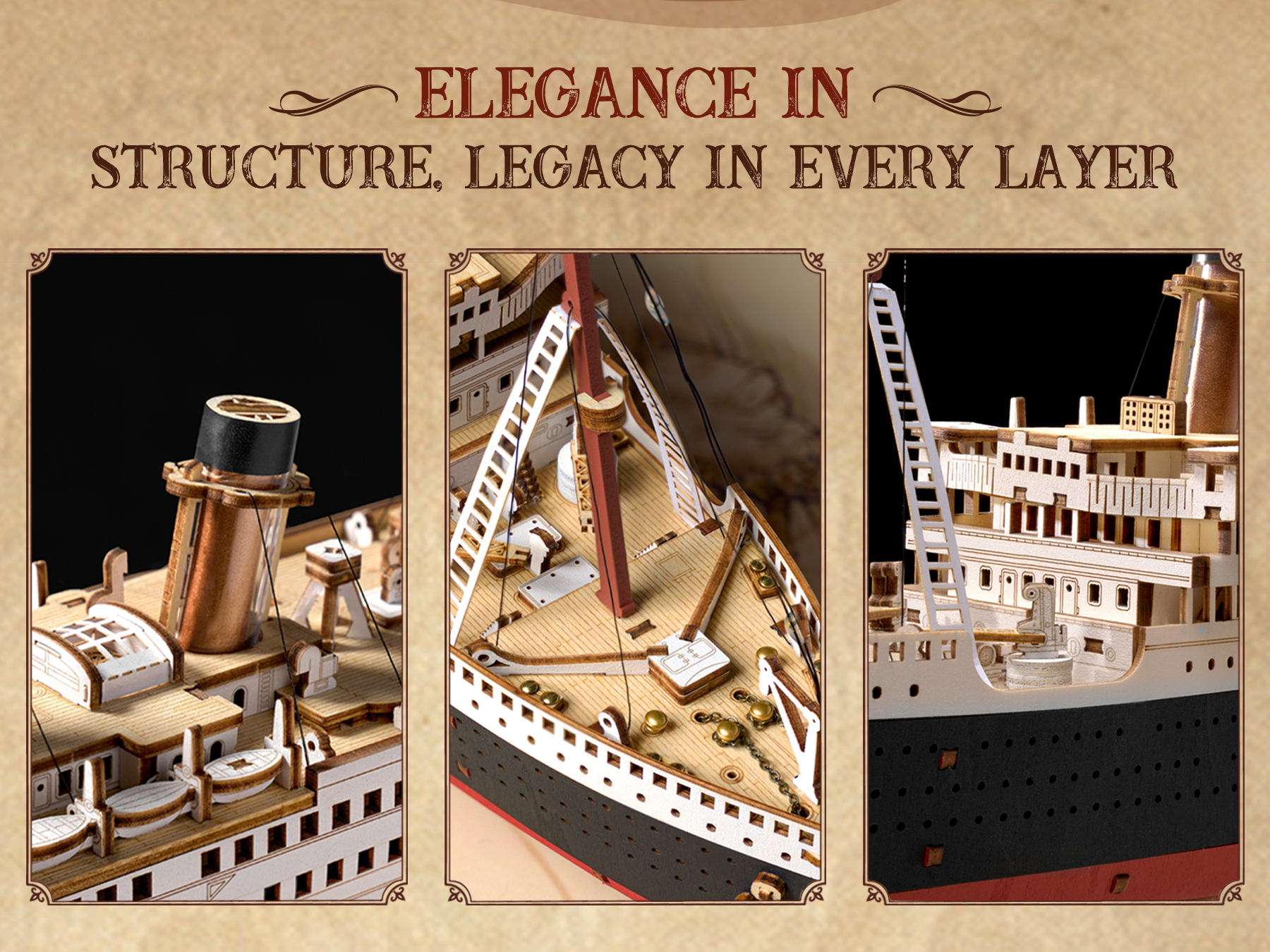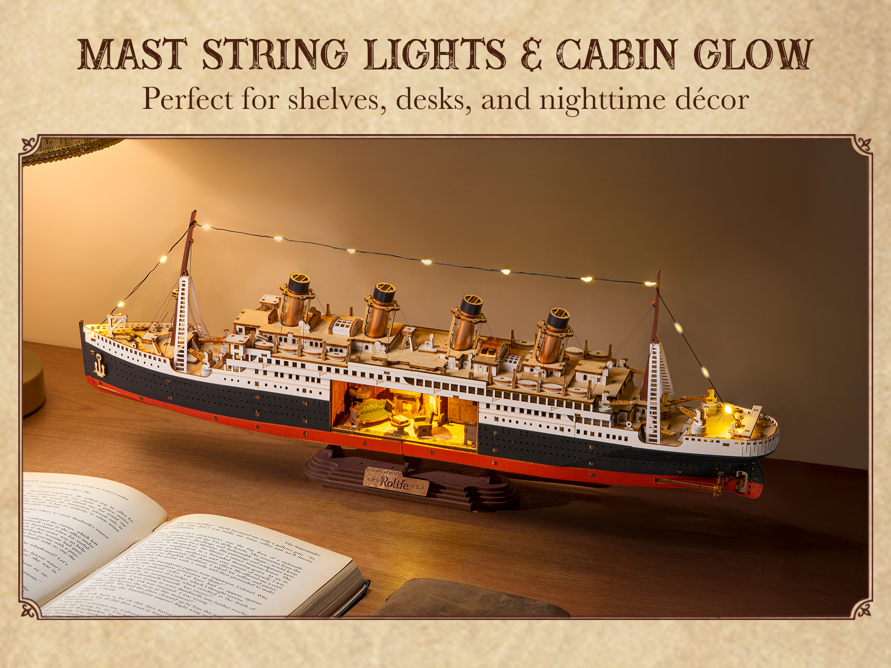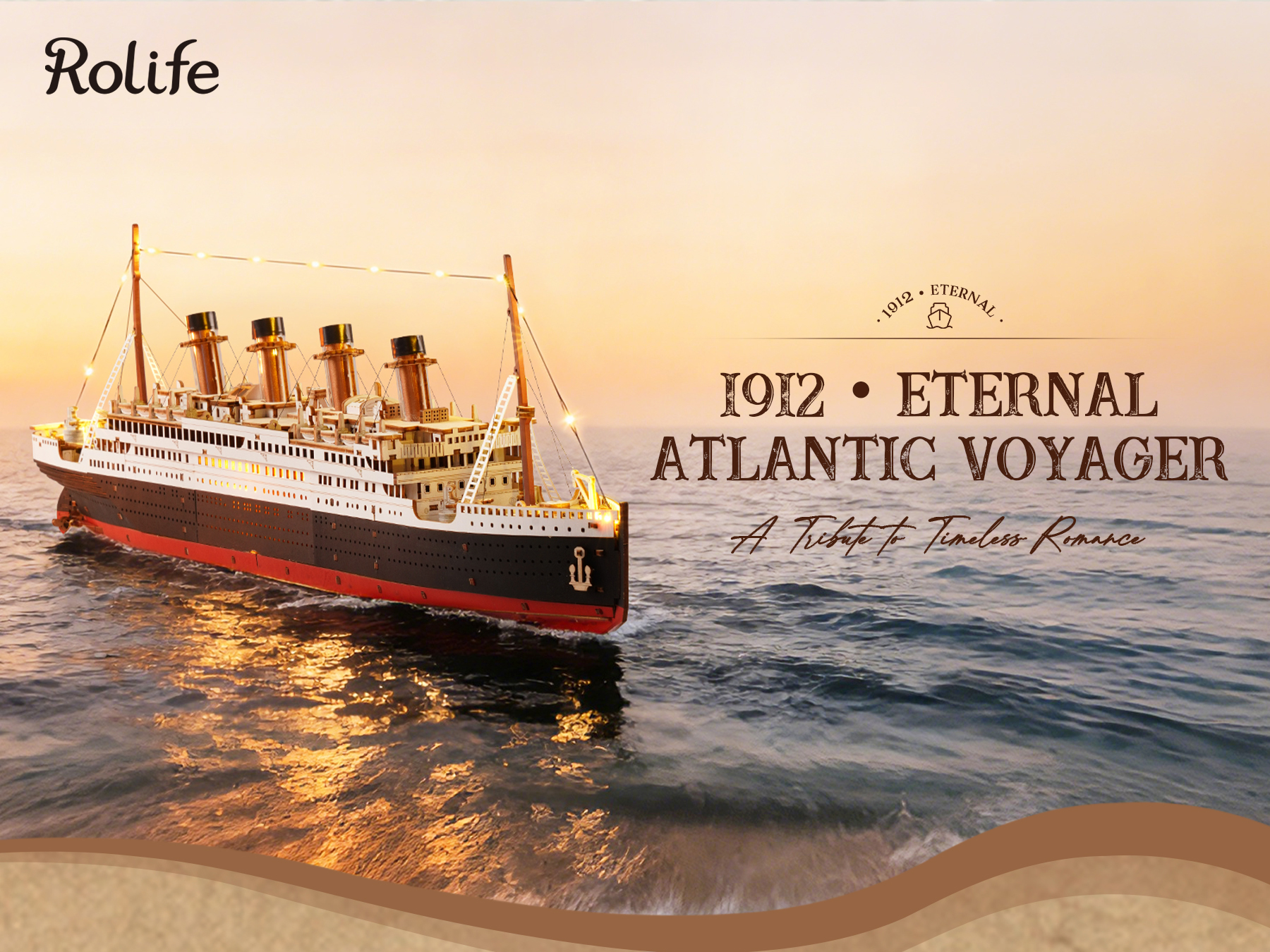 【A Meticulous Reproduction of a Classic Giant Ship】This model meticulously recreates the legendary 1912 "Eternal Voyager of the Atlantic". It boasts the iconic four funnels, anchor, and meticulously designed interior, including luxurious cabins and period-appropriate furniture, perfectly capturing the grandeur of the original ship.
