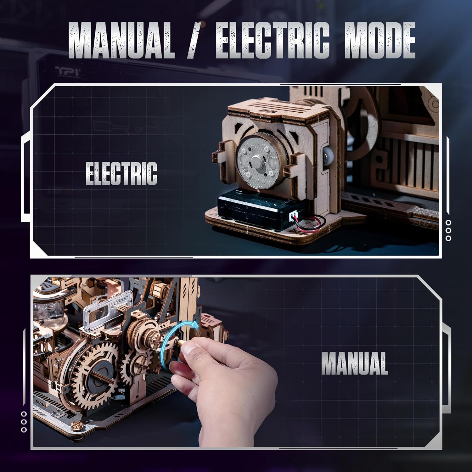 • ⚡【Hand-Cranked/Electric Motor Integrated】Experience the excitement as the mechanical gears start rotating, offering two modes of operation: manual and 70RPM super slow-speed electric motor, initiating a challenging and captivating adventure in the world of 3D puzzle Marble Spaceport.
