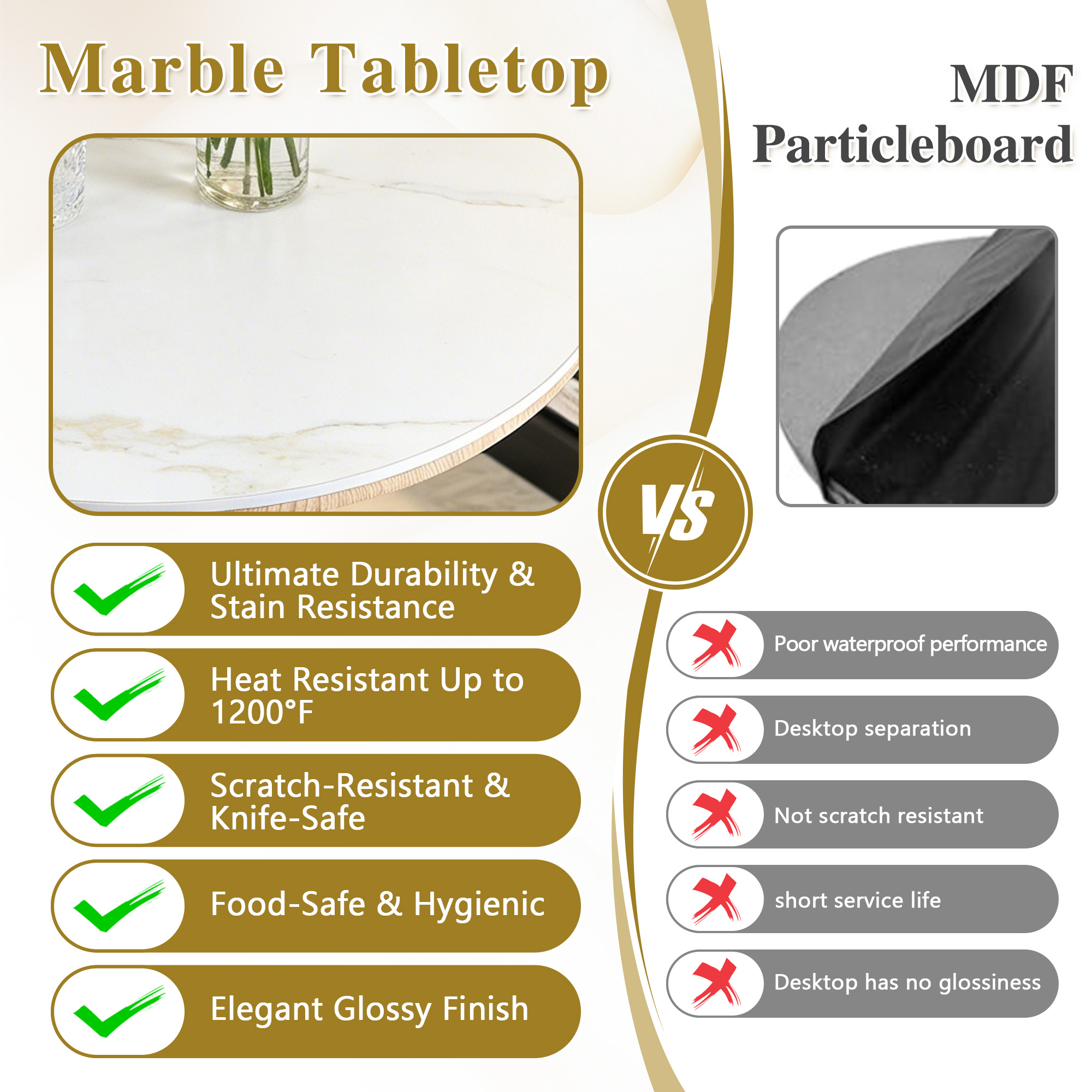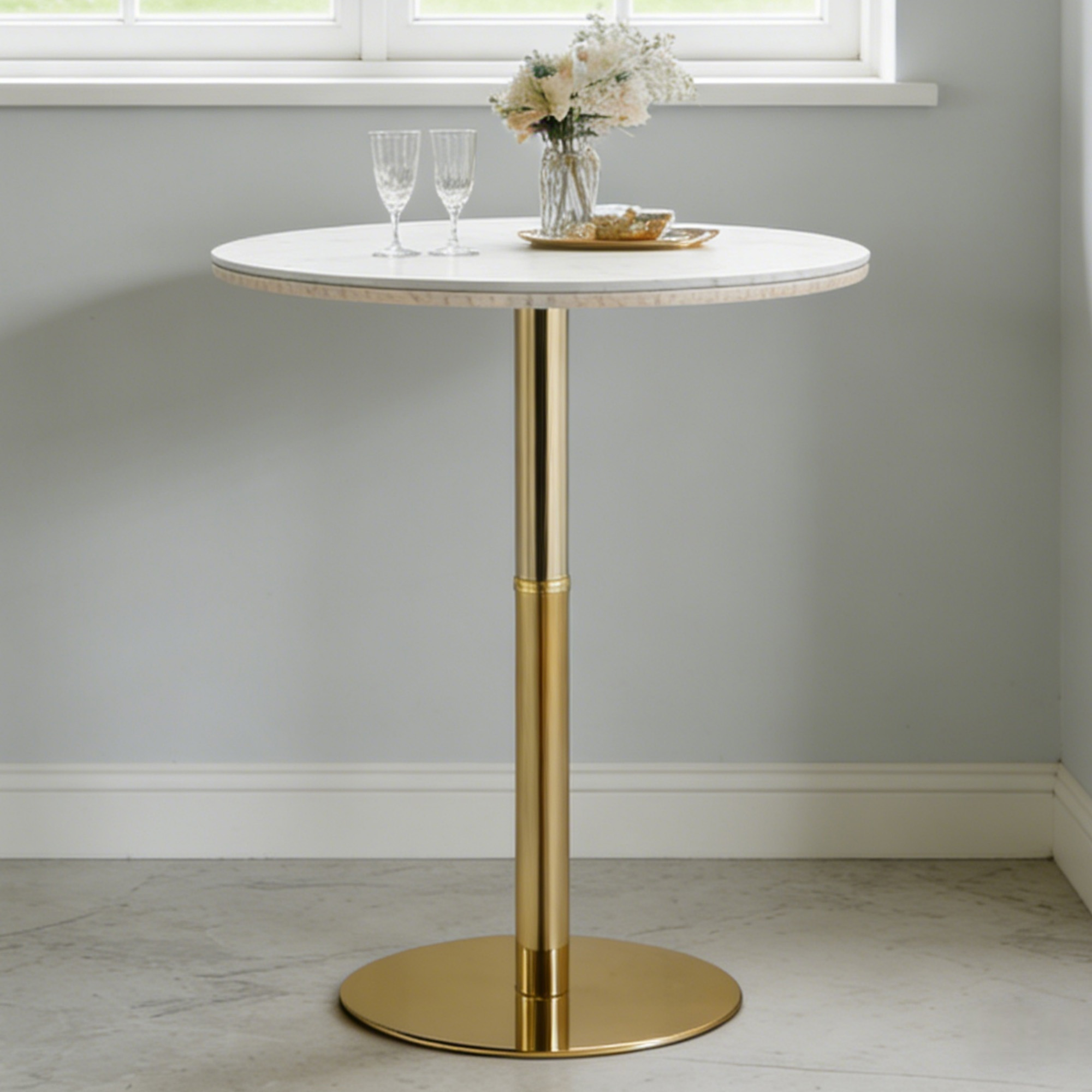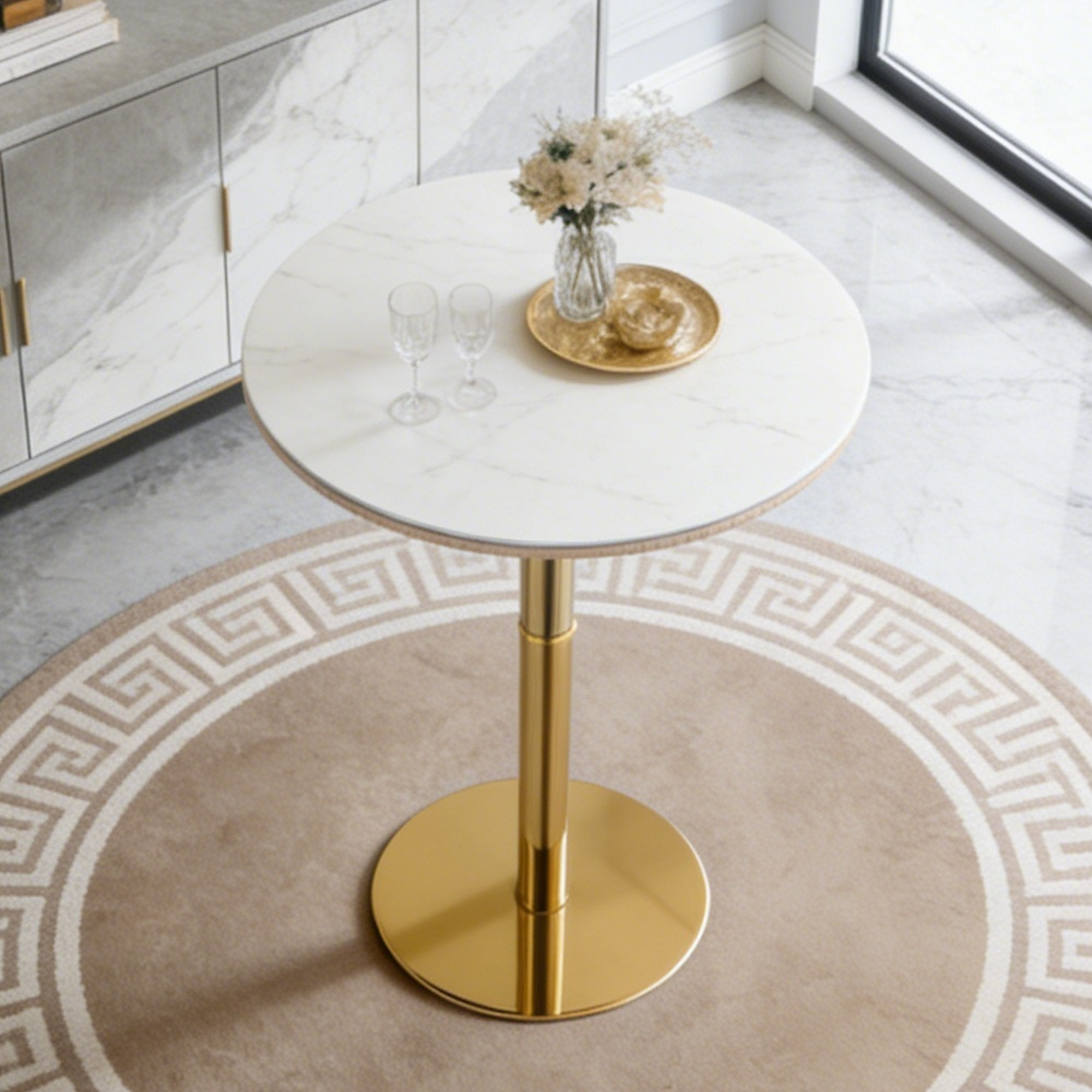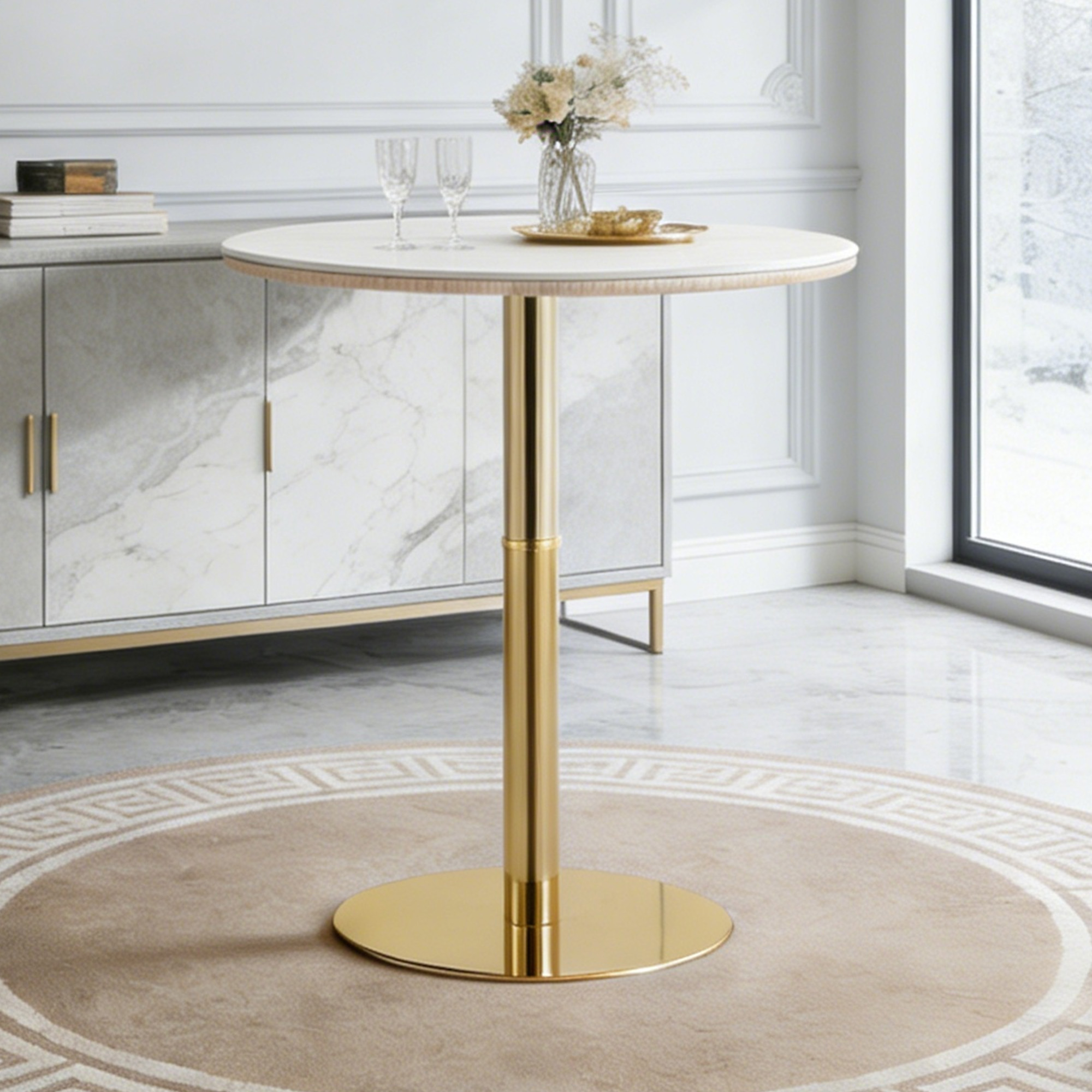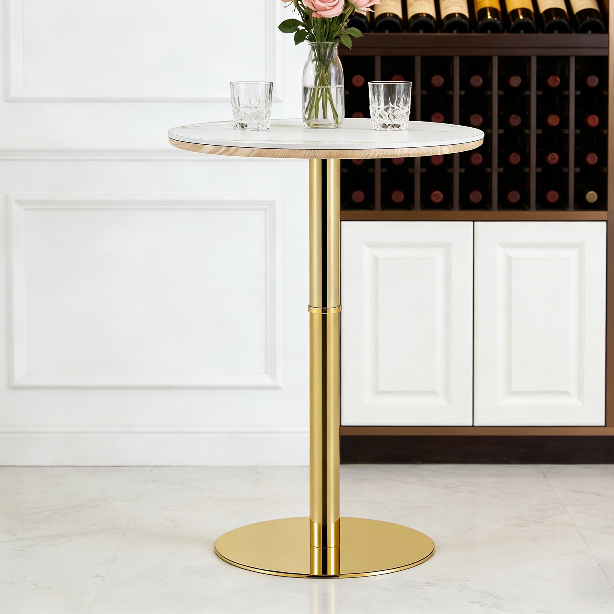 Product Name:Rock slab circular tabletop non adjustable (39.5 inches high) bar table, bar table with gold legs and base (white+gold)