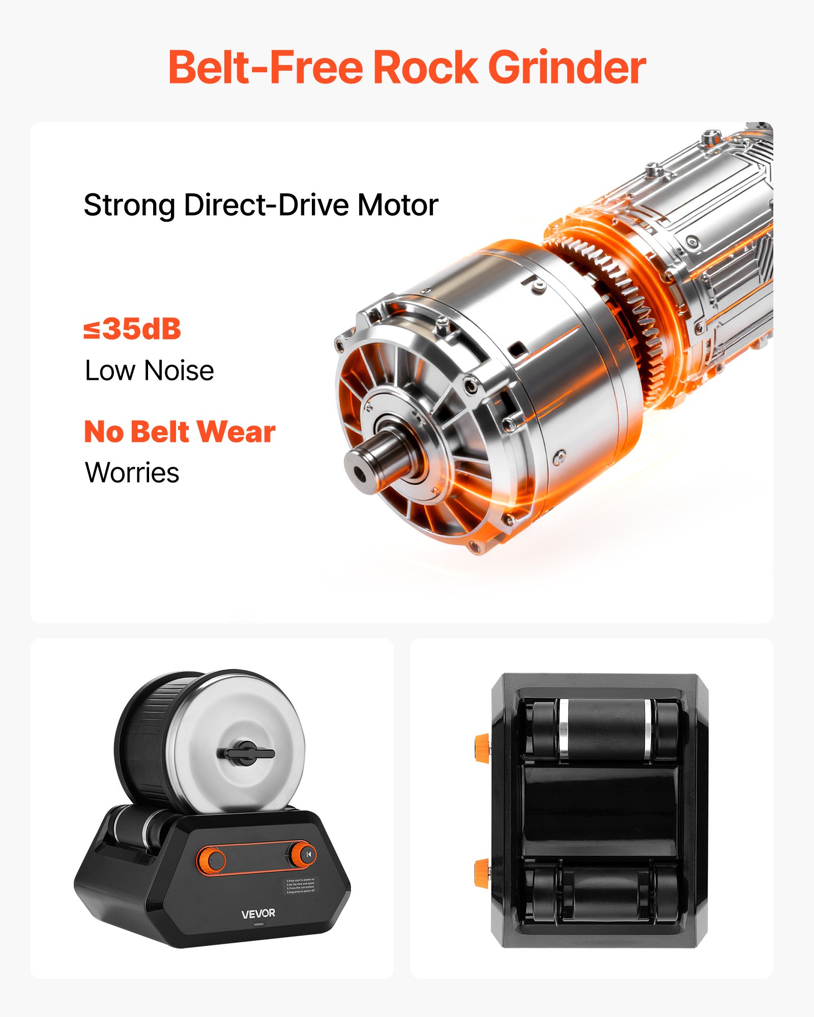 Belt-Free Direct-Drive Motor: This rock tumbler kit uses a low-voltage direct-drive motor for smoother, more efficient polishing without belt transmission, eliminating belt wear and replacement while reducing maintenance costs. It runs at ≤35 dB, letting you enjoy a quiet and comfortable creative experience