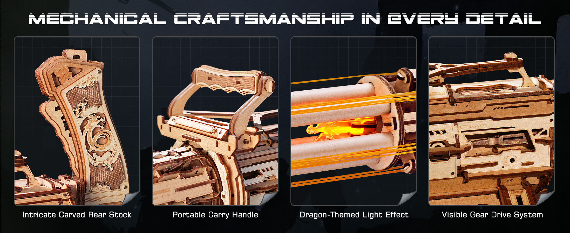 Experience sophisticated mechanical operation with two independent triggers. The electric trigger activates the rotating barrel and synchronized dragon flame light effects, while the mechanical press-fire trigger releases the rubber bands. This dual-action system delivers a highly engaging and realistic tactical experience.