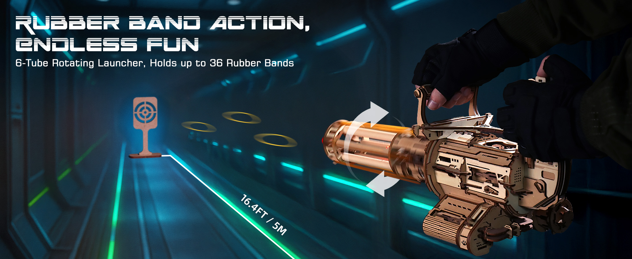 Engineered for continuous action, this model features a 6-barrel rotating chamber that can be pre-loaded with up to 36 rubber bands. This design allows for rapid volleys, recreating the sensation of sustained firepower and providing an exciting gameplay element after assembly.