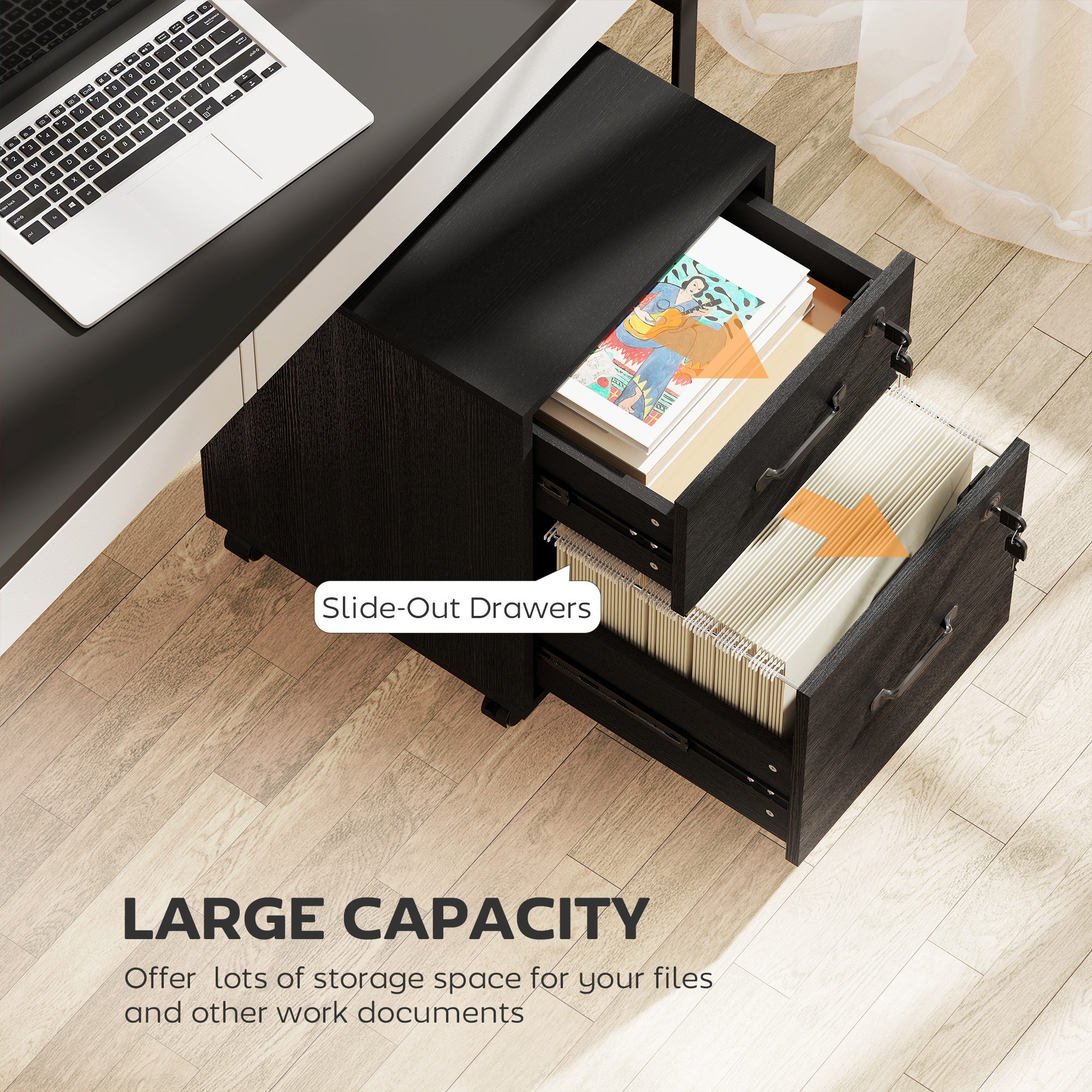 Blending storage space and a compact size into a sleek wood-effect design, this filing cabinet from is made to make you fall in love with your office space once again. It features a small top drawer and a large bottom drawer to give you all the room needed for files and stationery. There is a rail in the bottom drawer for hanging your letter files for organisation. Four wheels are fitted on the bottom for easy movement - two of which can be locked to keep the unit in place when needed.