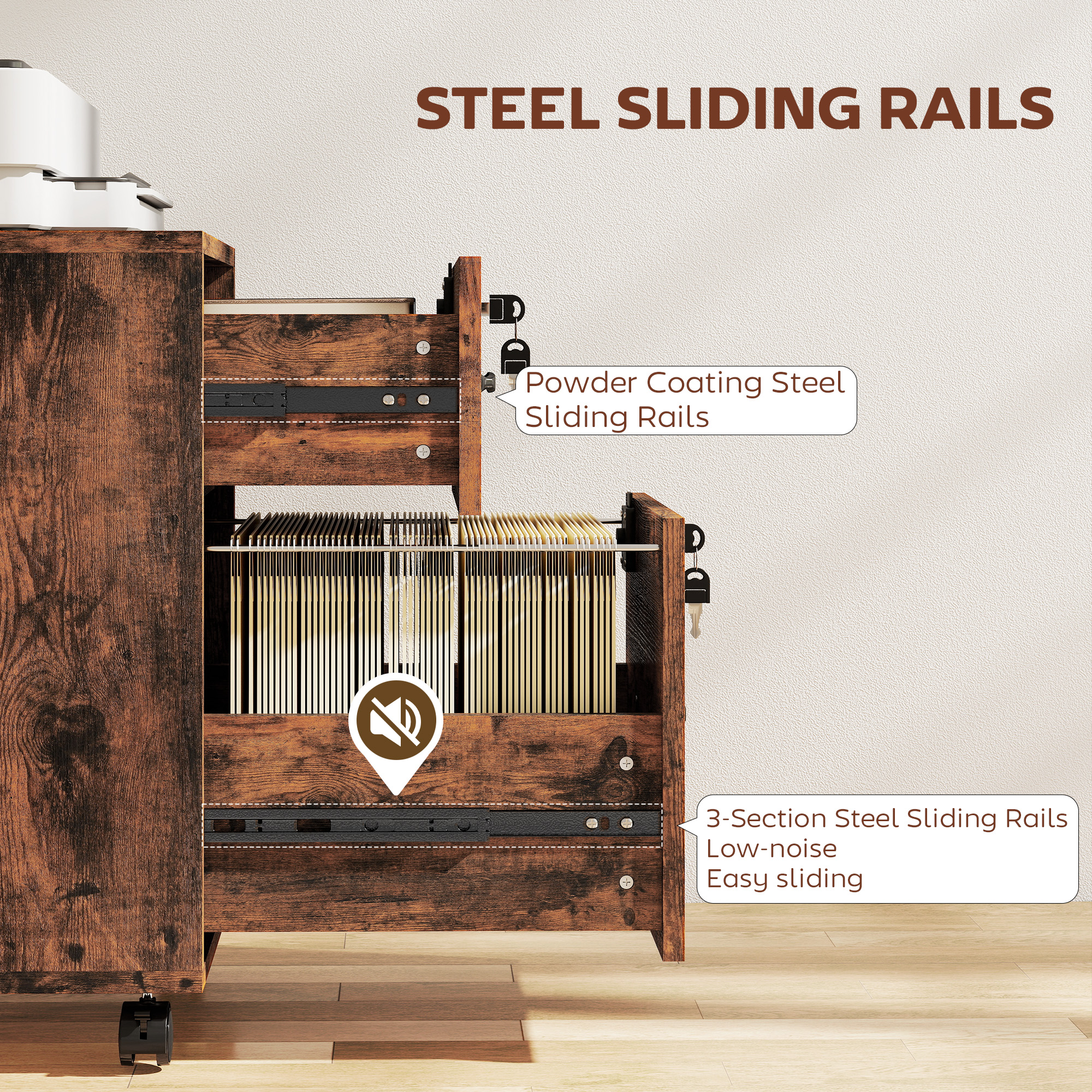 Blending storage space and a compact size into a sleek wood-effect design, this filing cabinet from is made to make you fall in love with your office space once again. It features a small top drawer and a large bottom drawer to give you all the room needed for files and stationery. There is a rail in the bottom drawer for hanging your letter files for organisation. Four wheels are fitted on the bottom for easy movement - two of which can be locked to keep the unit in place when needed.