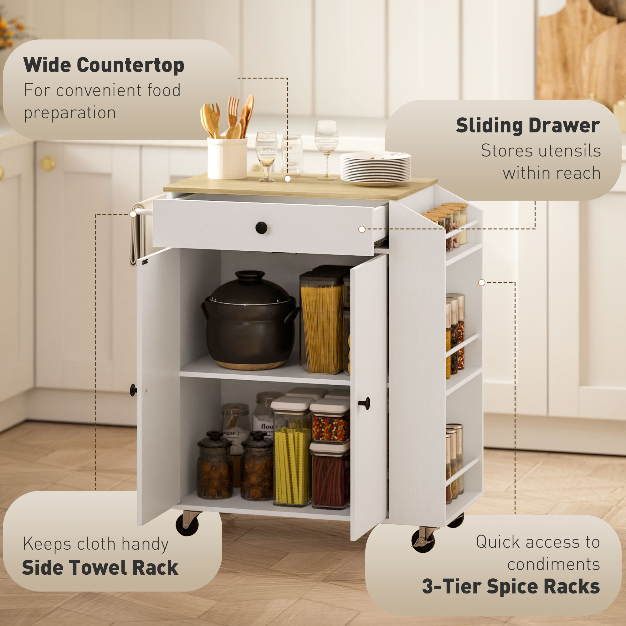 Explore the sophistication and adaptability of the kitchen cart. Its lots of work surface makes meal preparation enjoyable. Featuring a handy drawer and a cabinet with an adjustable shelf for extra storage of kitchen tools. The three-level spice rack and side towel bar enhance this kitchen cart's utility, making it an essential, space-saving addition for any event.