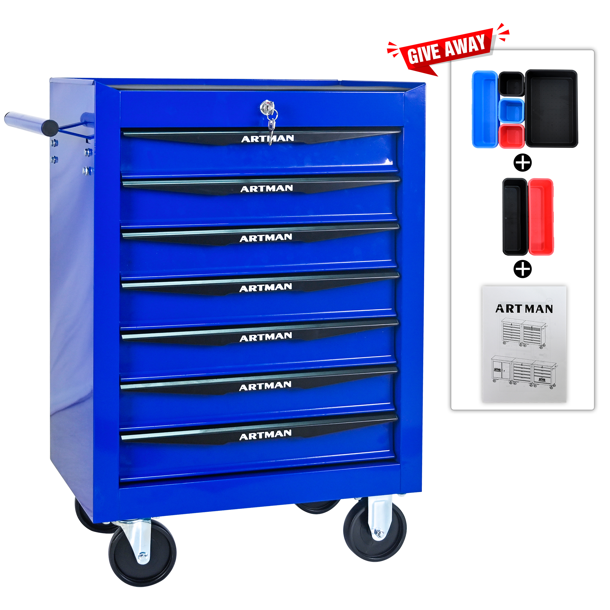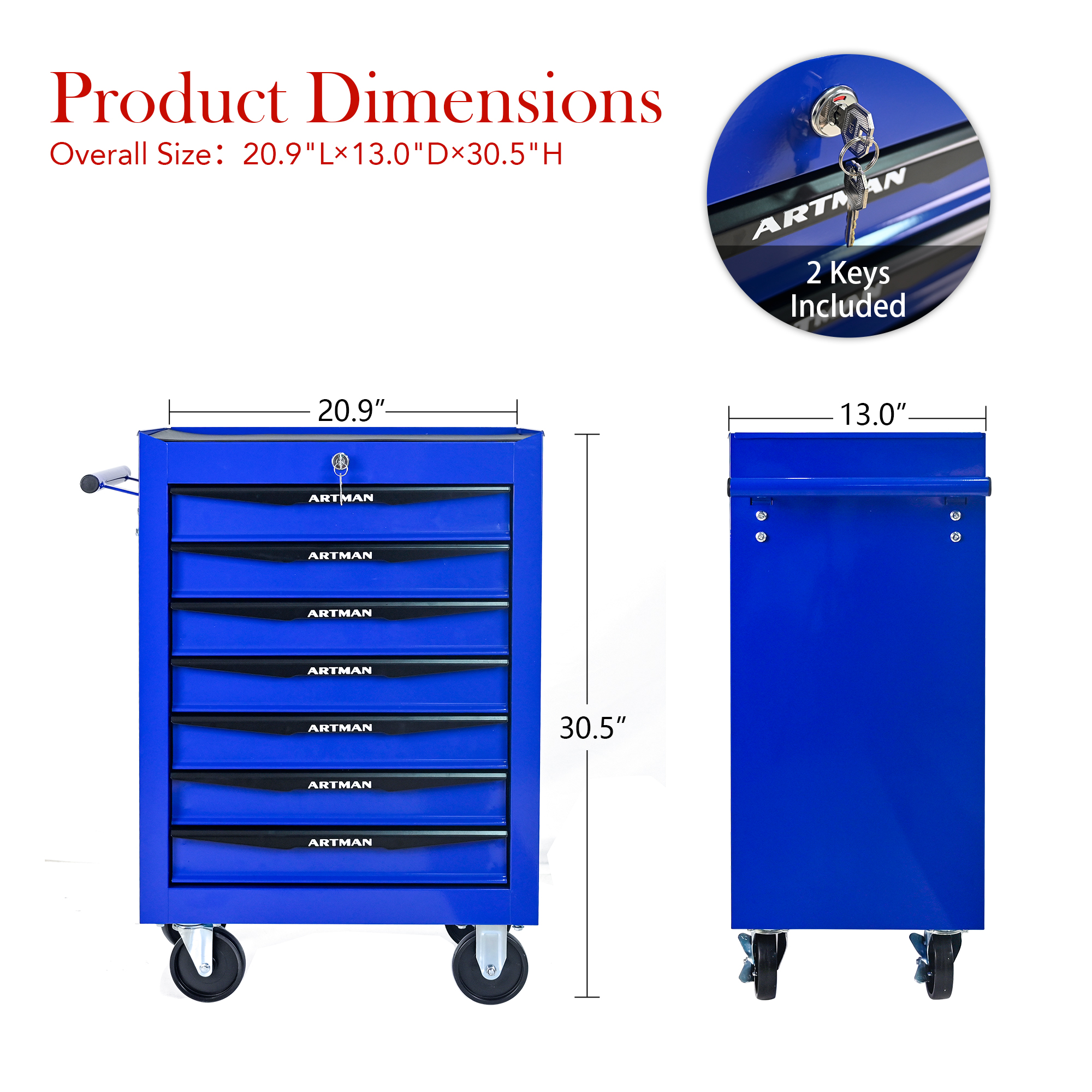 Product Name:Rolling Metal Tool Chest with 7 Drawers, 20" 7-Drawer Tool Chest Cabinet with Ball Bearing Drawer Slides, Steel Tool Storage Box Organizer -BLACK&BLUE