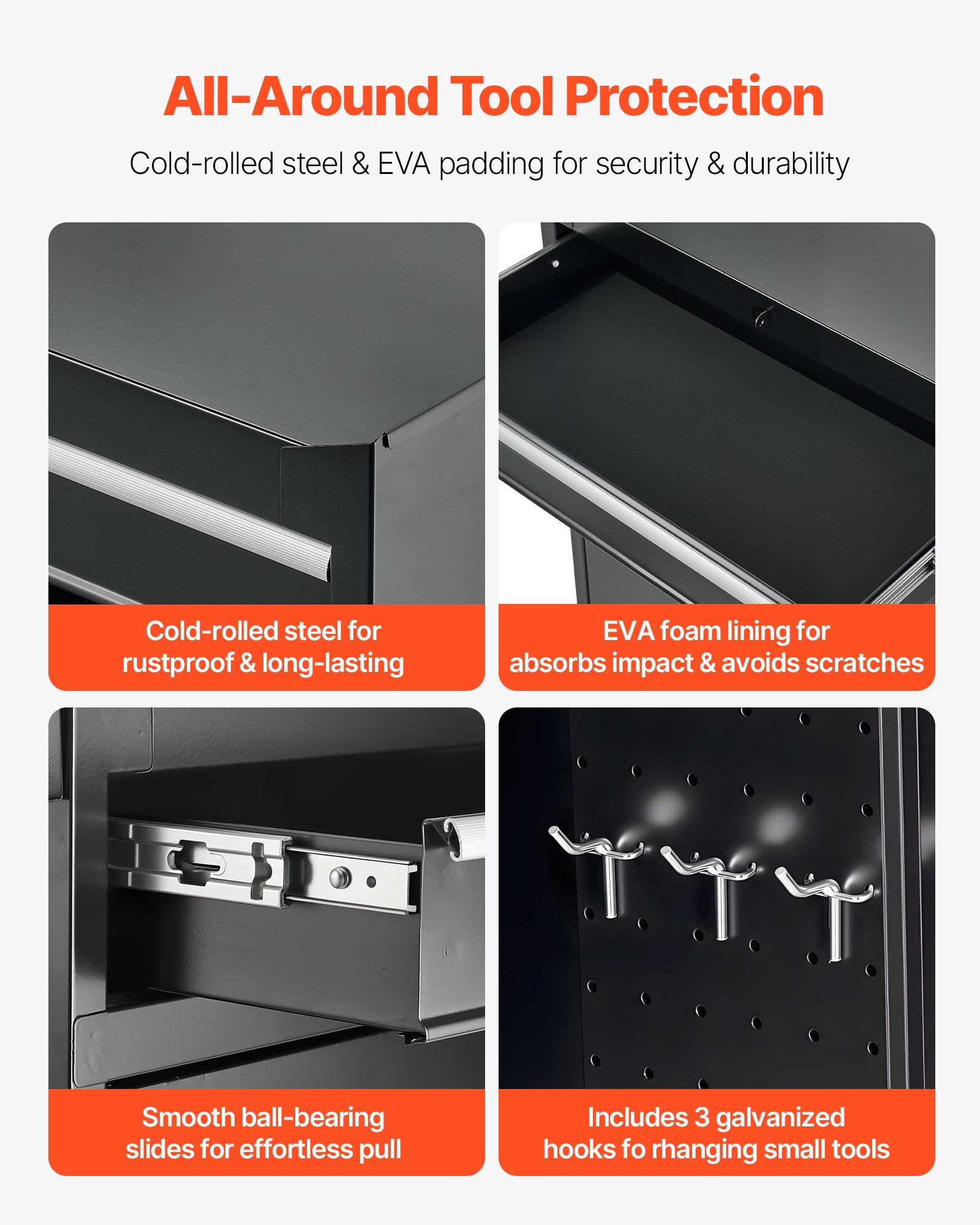 All-Steel & EVA Protection: Made of cold-rolled steel with a powder-coated surface, the rolling tool cabinet resists corrosion, rust, and wear. The built-in EVA padding reduces vibration, noise, and metal tool collisions to ensure the items' longevity