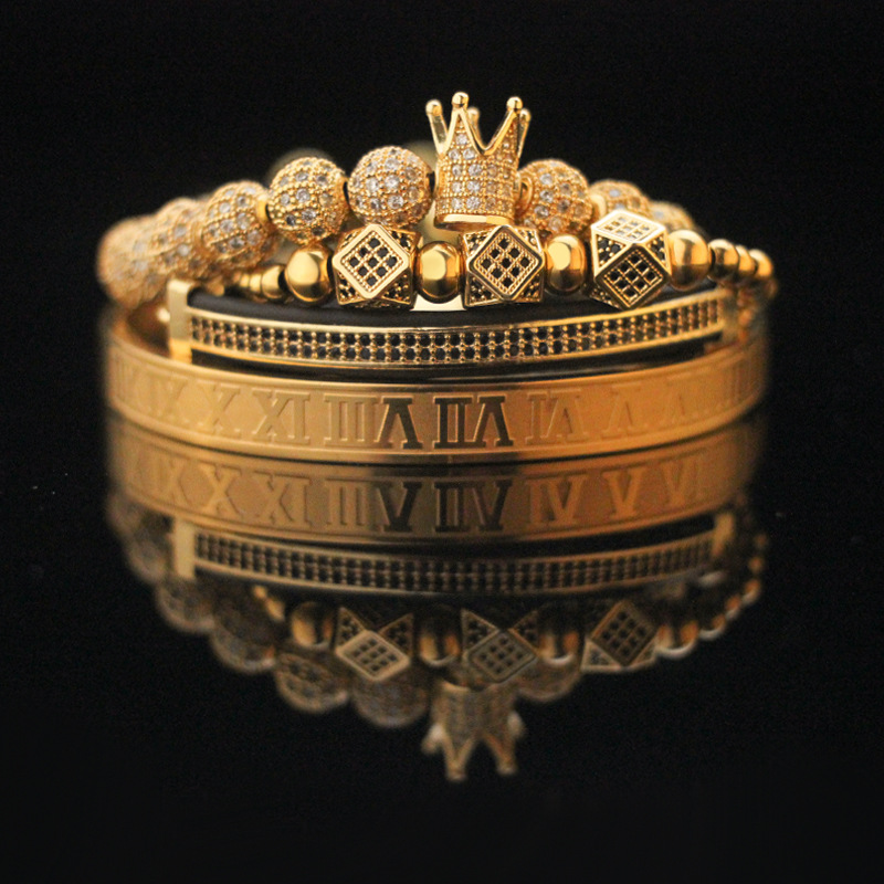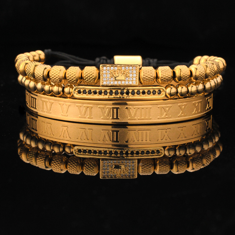 Roman Numeral Bronze Zircon Crown Woven Bracelet Set