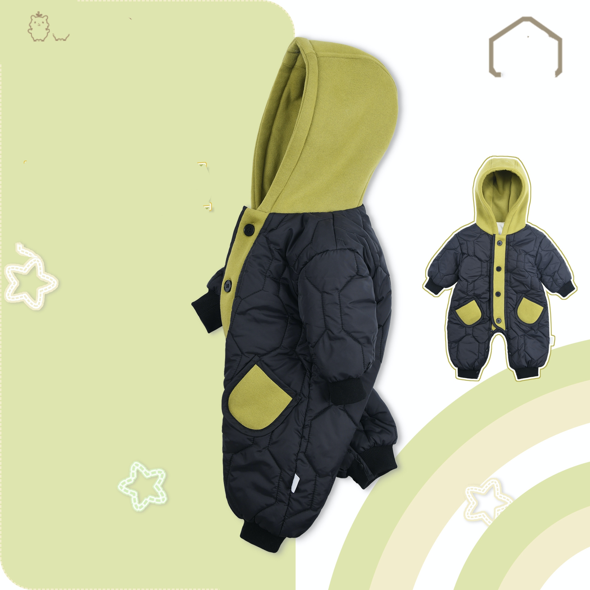 Color: Black and green hooded jumpsuit, beige hooded jumpsuit