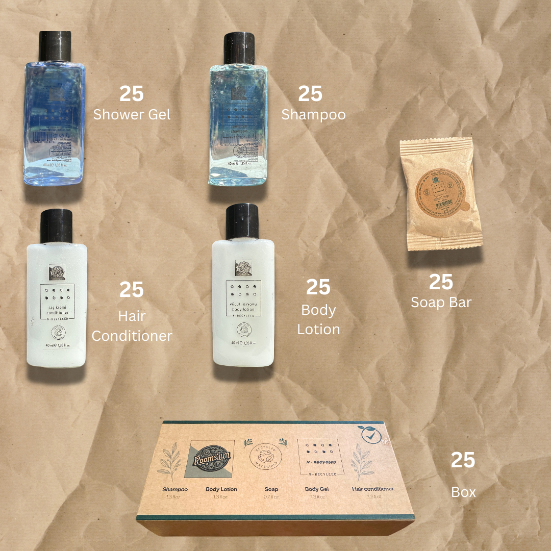 Elevate your hospitality experience with the N-Recycled Turkish Bath Retreat, a thoughtfully curated 125-piece toiletries set by Roomsium. Inspired by the indulgent rituals of a Turkish Bath, this eco-luxe collection is designed with sustainability at its core—everything in this product is recyclable, from the N-Recycled materials to the packaging. Perfect for hotels, guesthouses, Airbnb hosts, and more, this set ensures every guest enjoys a refreshing, eco-conscious pampering session.