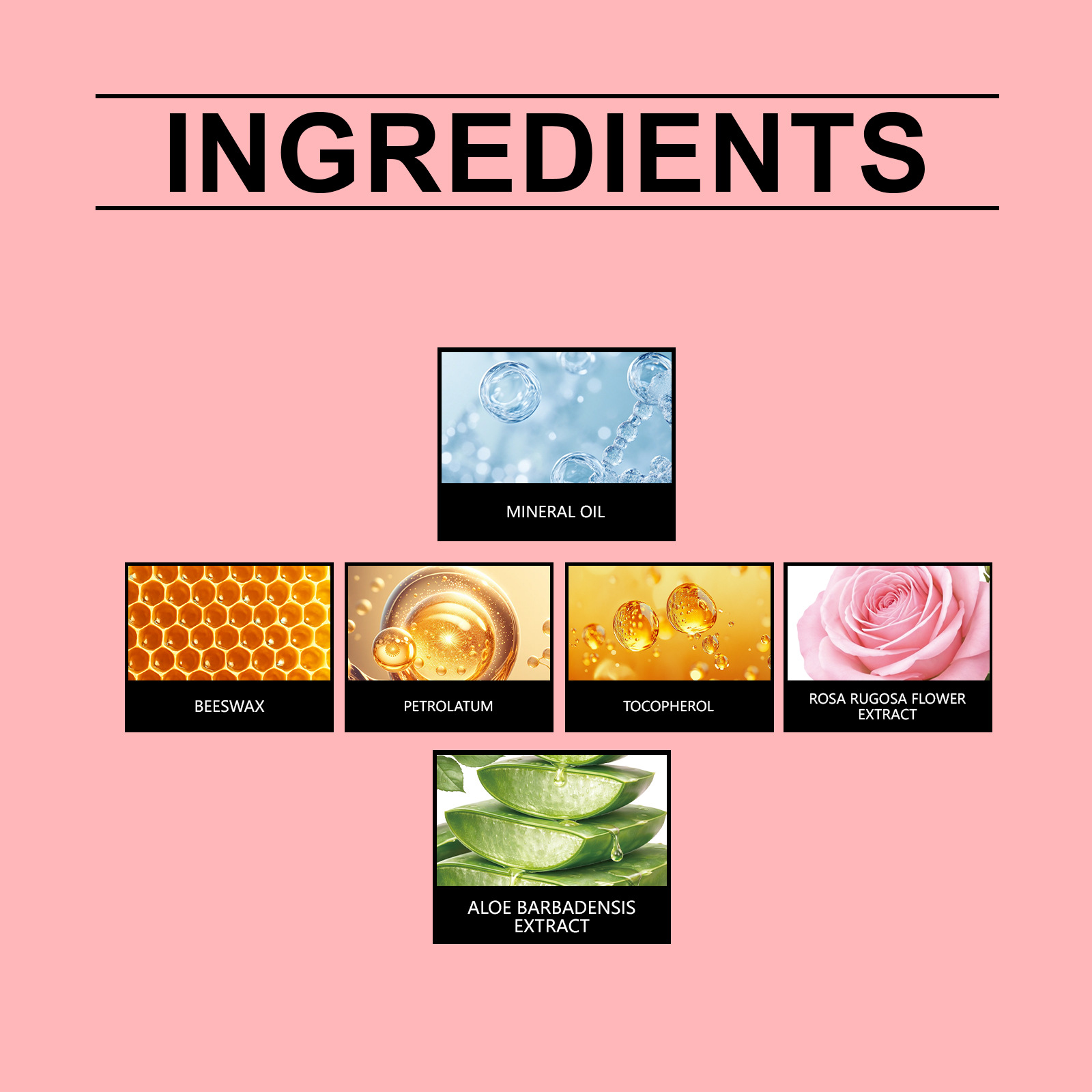 Ingredients: mineral oil, beeswax, petrolatum, tocopherol (vitamin E), ROSA RUGOSA flower extract, ALOE BARBADENSIS extract.