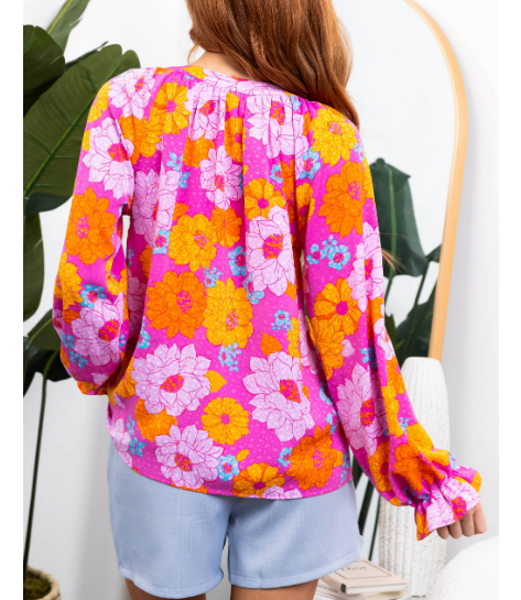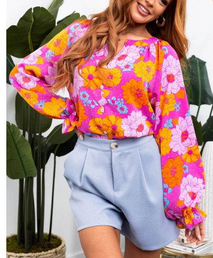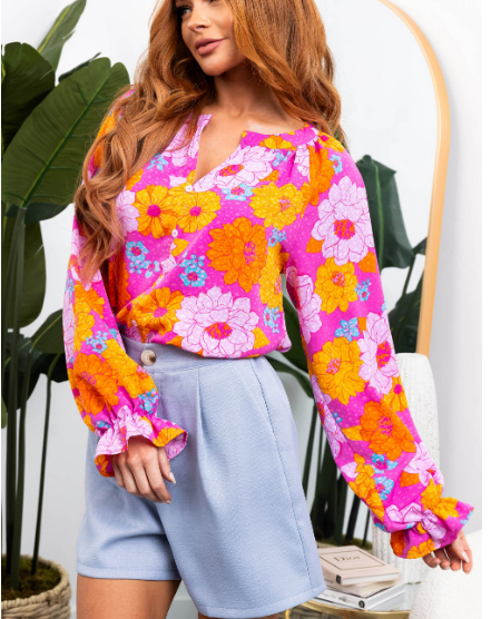 Rose Floral Print Flounce Sleeve Notched Neck Blouse