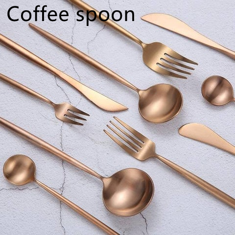 Color: Rose gold main table knife, rose gold main table fork, rose gold main table spoon, rose gold coffee spoon, rose gold dessert knife, rose gold dessert fork, rose gold dessert spoon, rose gold butter knife, rose gold three-tooth fork , Rose gold two-tooth fork, rose gold chopsticks, rose gold long ice spoon, black gift box