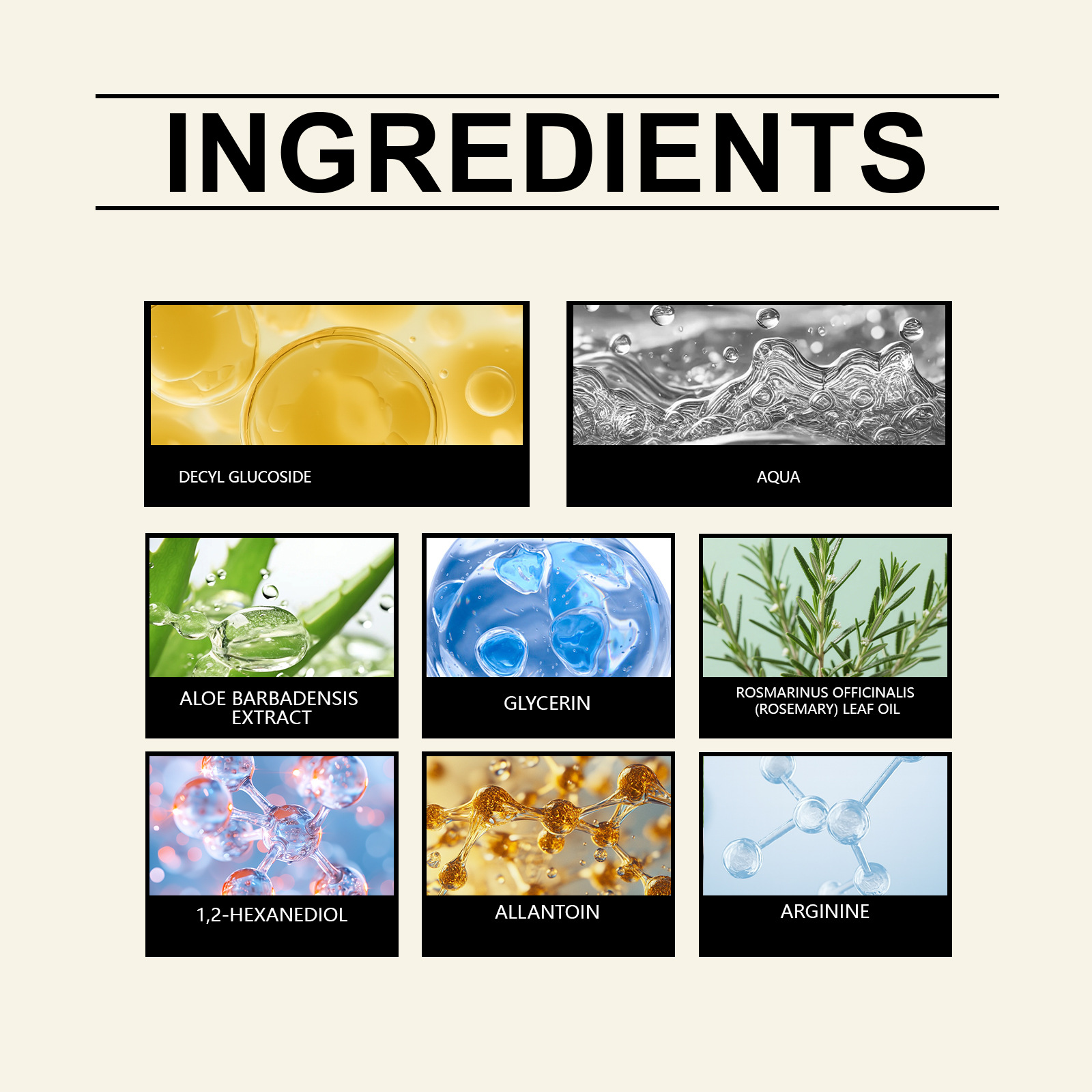 Ingredients: water, decyl glucoside, glycerin, aloe vera extract, 1,2-hexanediol, allantoin, arginine, rosemary leaf oil.