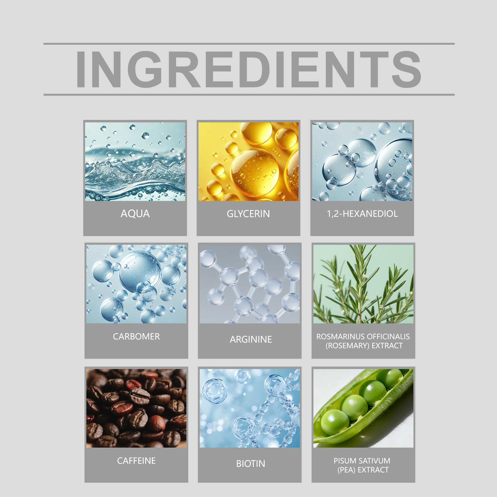 Ingredients: water, glycerin, 1,2- hexanediol, carbomer, arginine, rosemary extract, caffeine, biotin, pea extract.