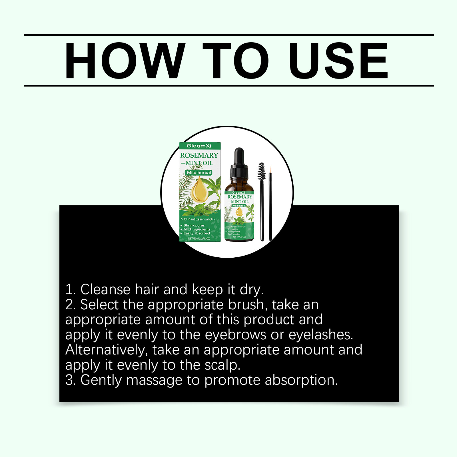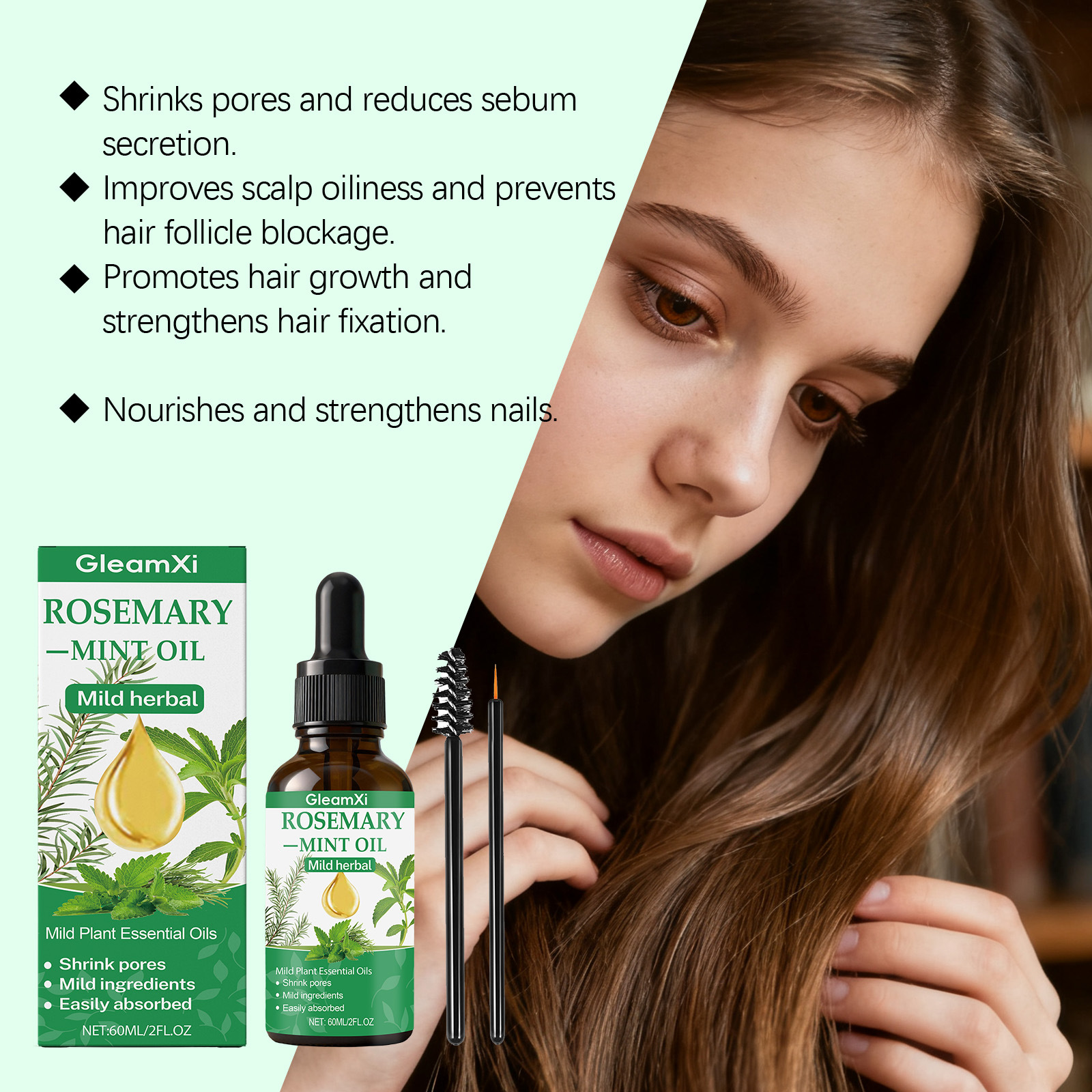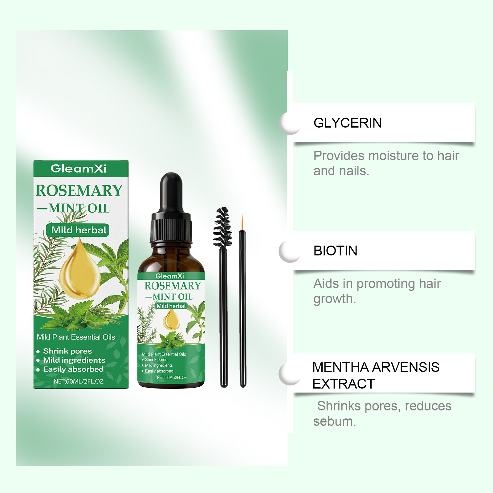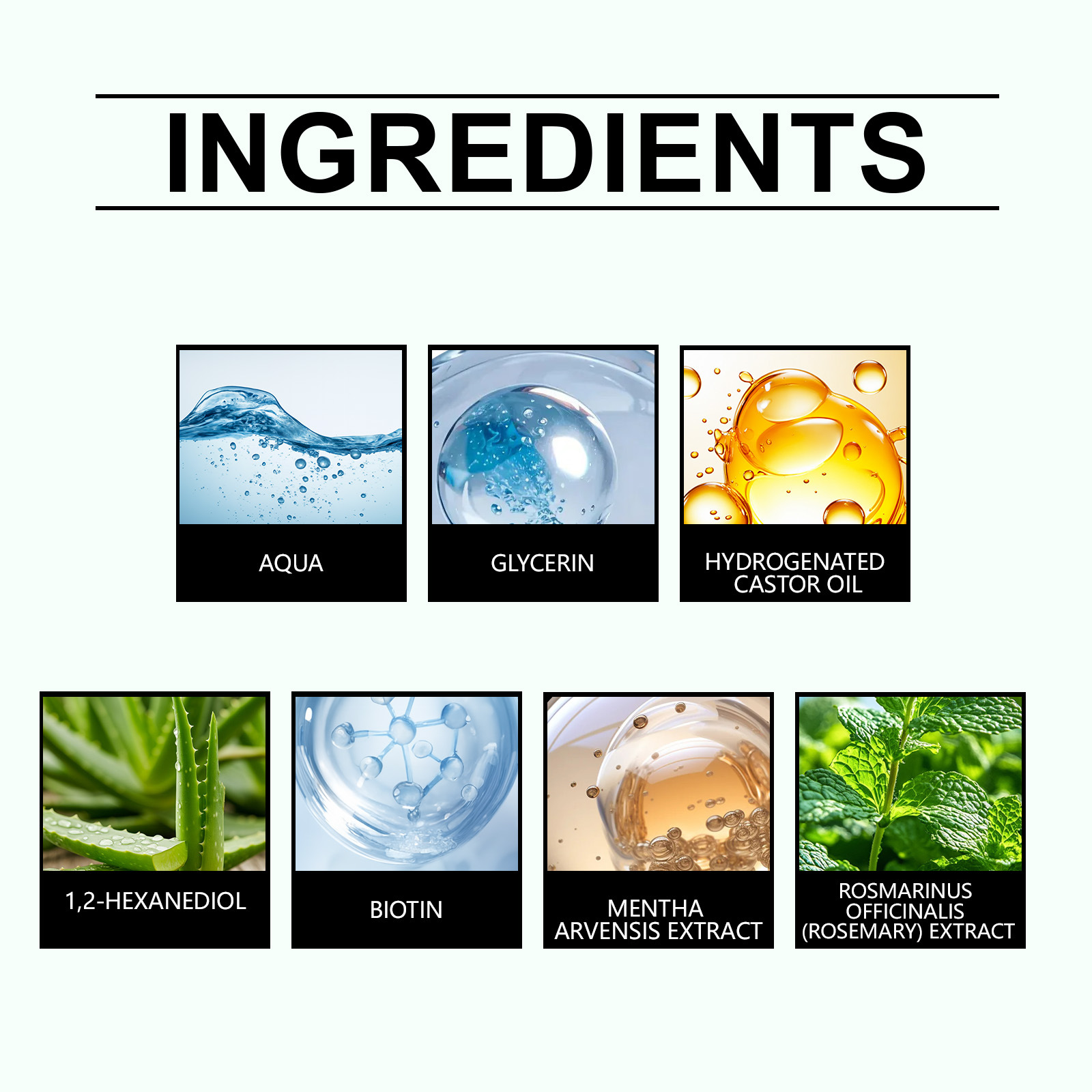 Ingredients: water, glycerin, hydrogenated castor oil, 1,2- hexanediol, biotin, mint extract, rosemary extract.