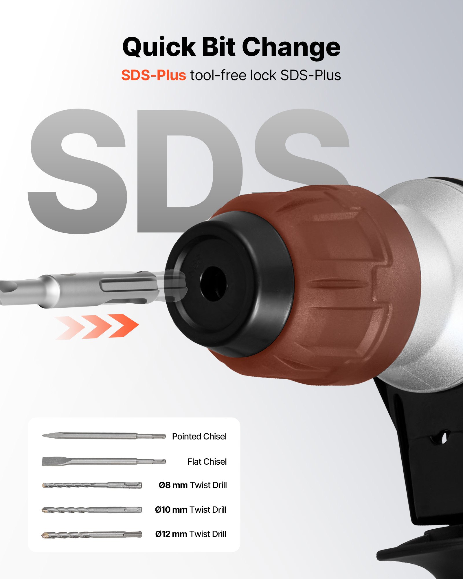 SDS-Plus Chuck for Quick Bit Changes: The SDS-Plus system allows tool-free, secure bit changes in seconds. Compatible with various drill and chisel sizes, this SDS-Plus rotary hammer drill ensures efficient transitions between drilling and chiseling tasks