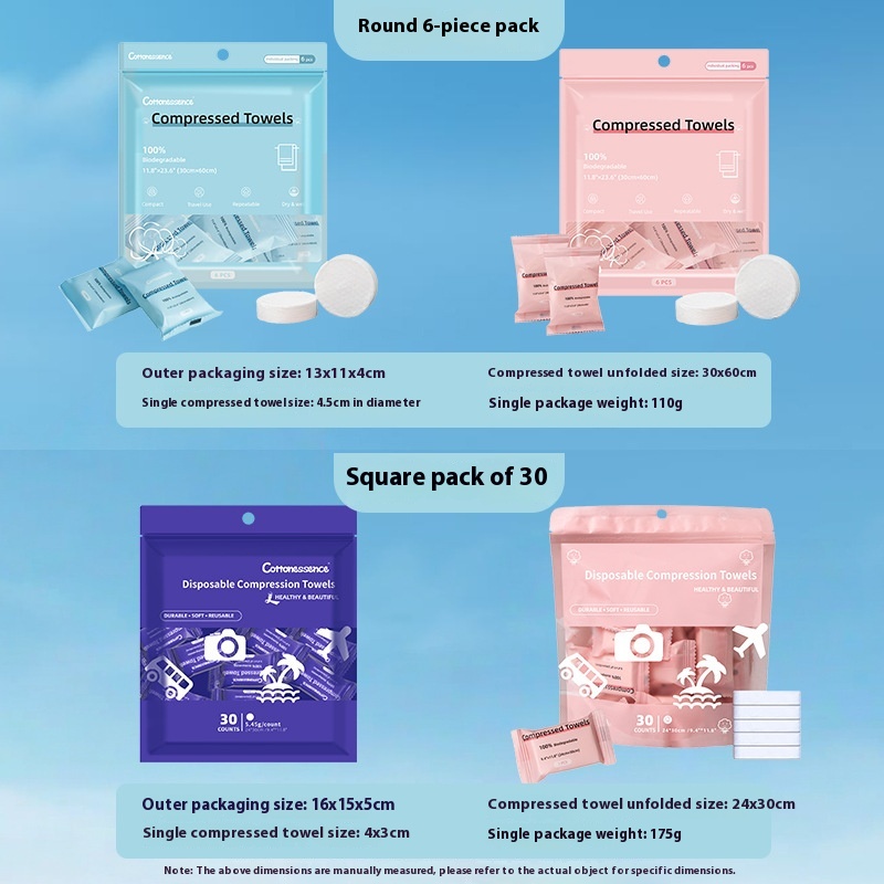 Color Blue Compressed Towel 6 Pcs 30 60cm, Pink Compressed Towel 6 Pcs 30 60cm, Blue Transparent Inner Bag 6 Pcs 30 60cm, Pink Compressed Towel 30 30cm, Blue 30 Compressed Towels 24 30cm