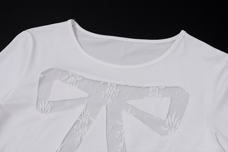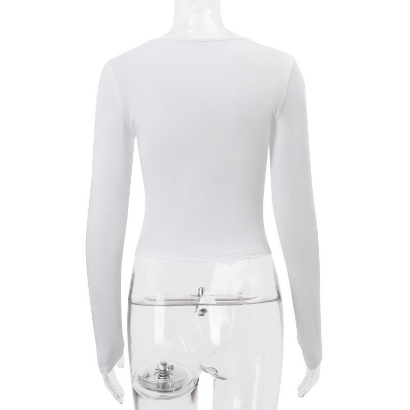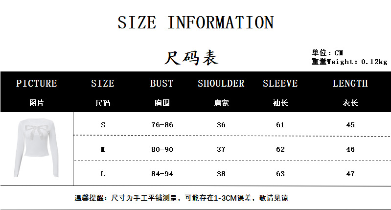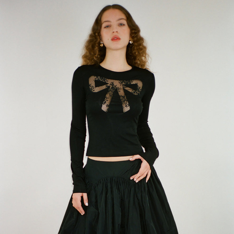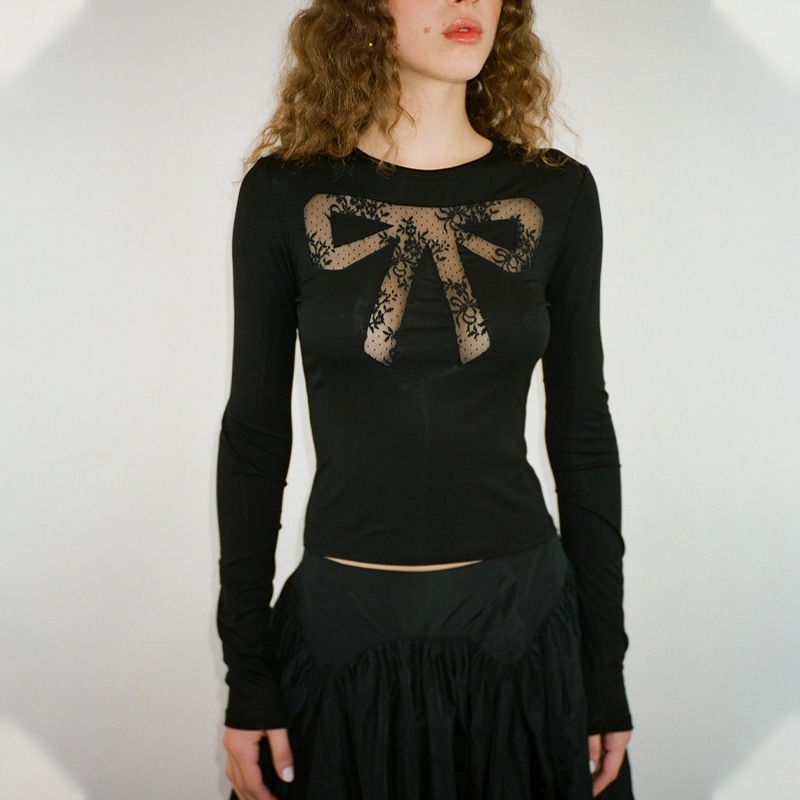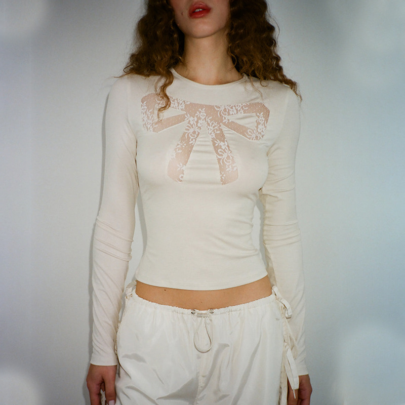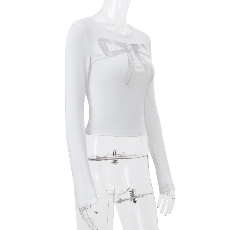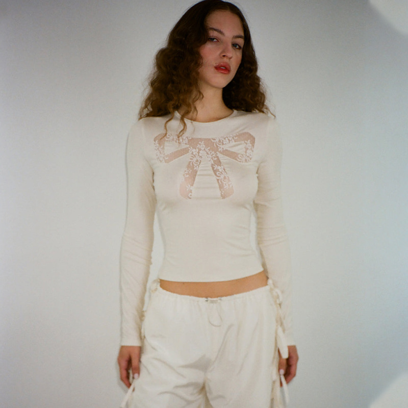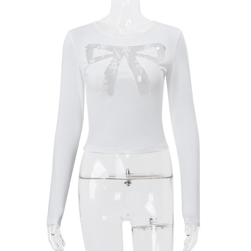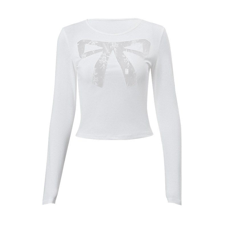 Round Neck Bowknot Printed Midriff-baring Long Sleeve Top T-shirt