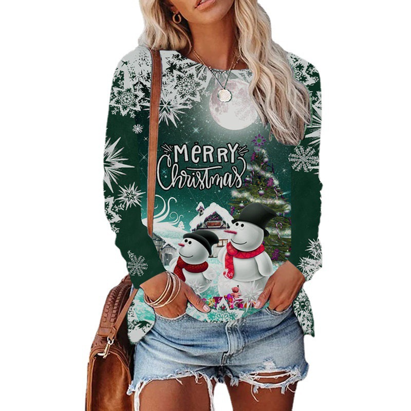 Round Neck Christmas T-shirt Printed Long Sleeve Top