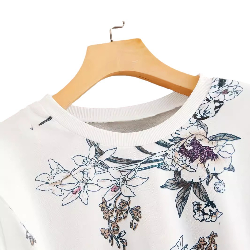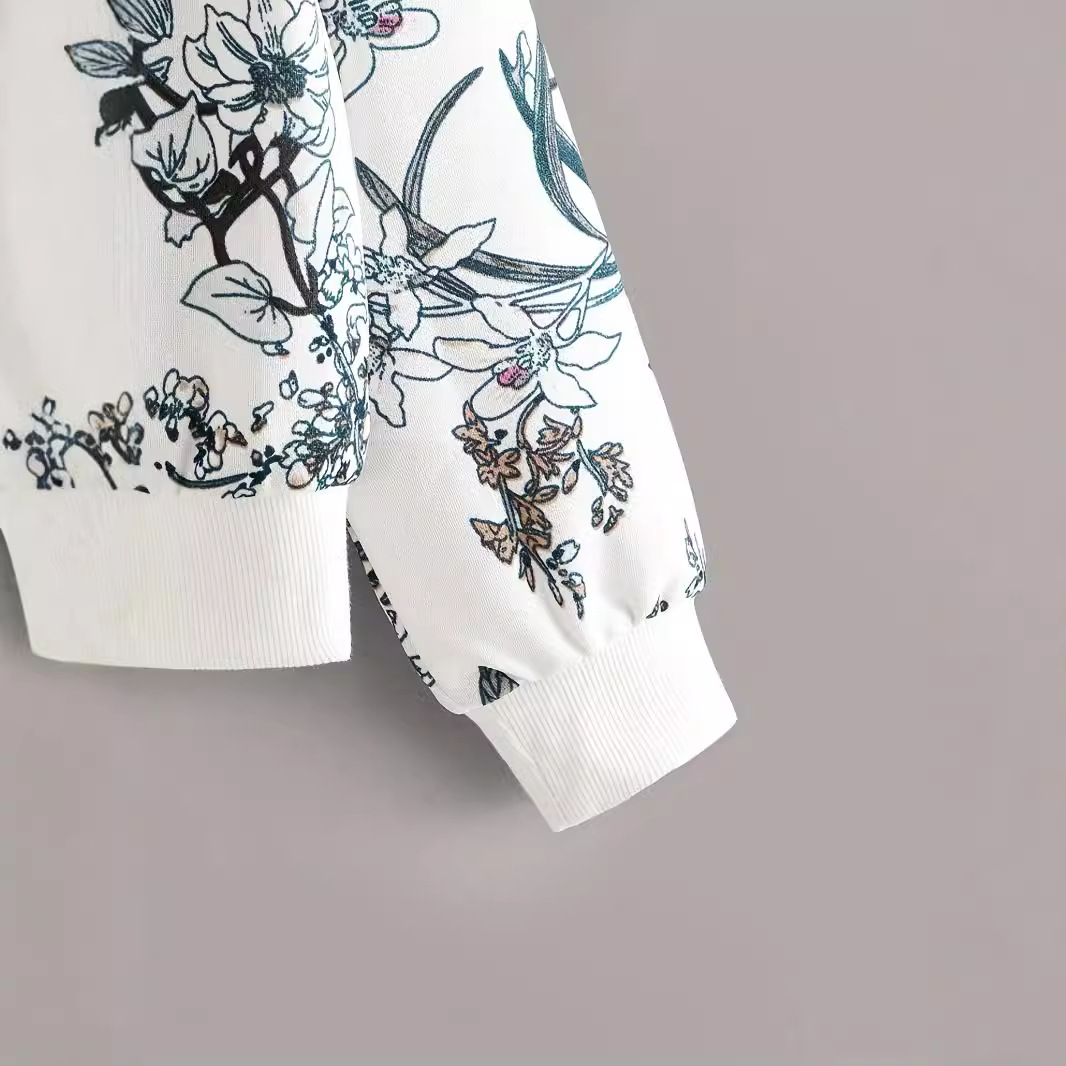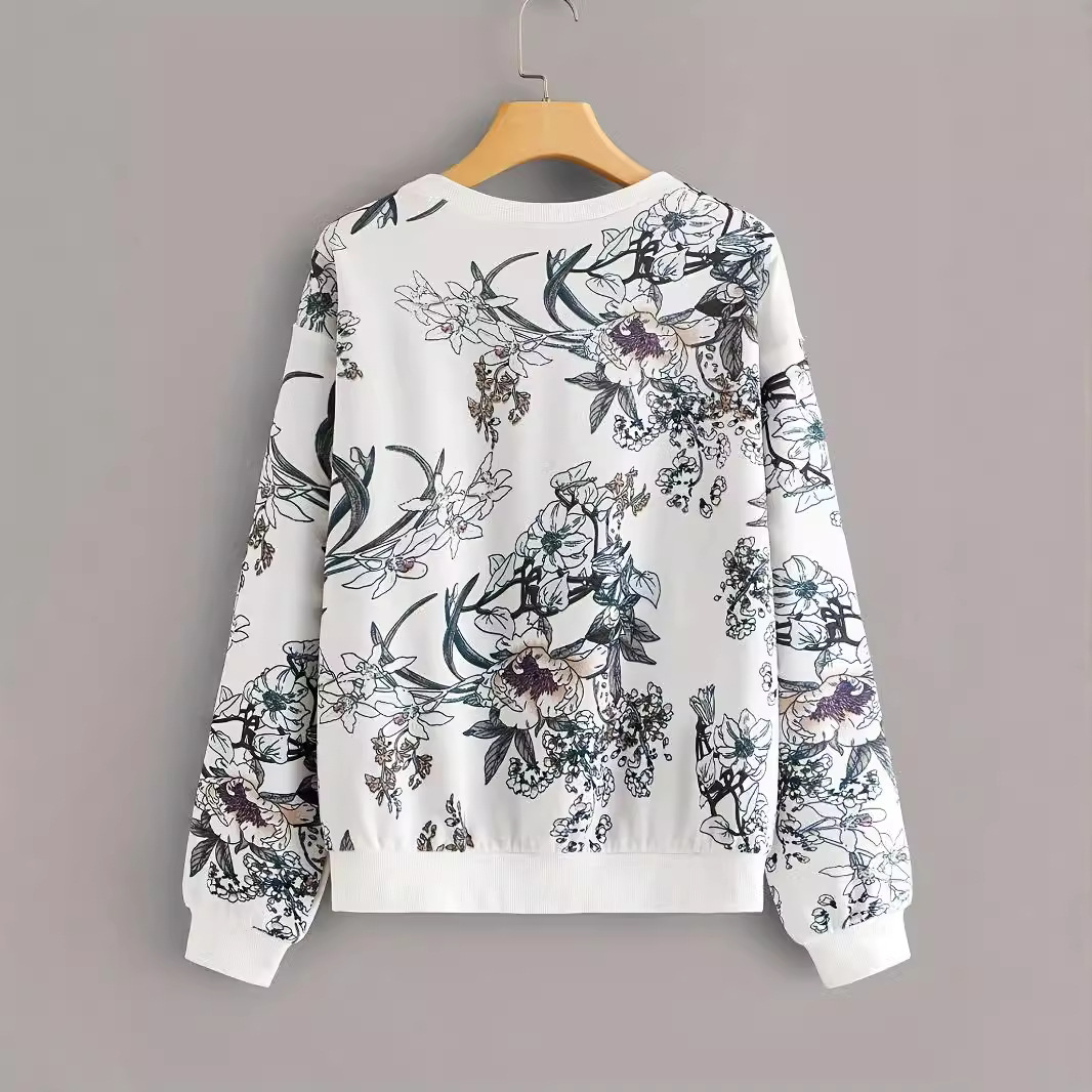 Round Neck Drop-shoulder Plant Flower Print Sweater