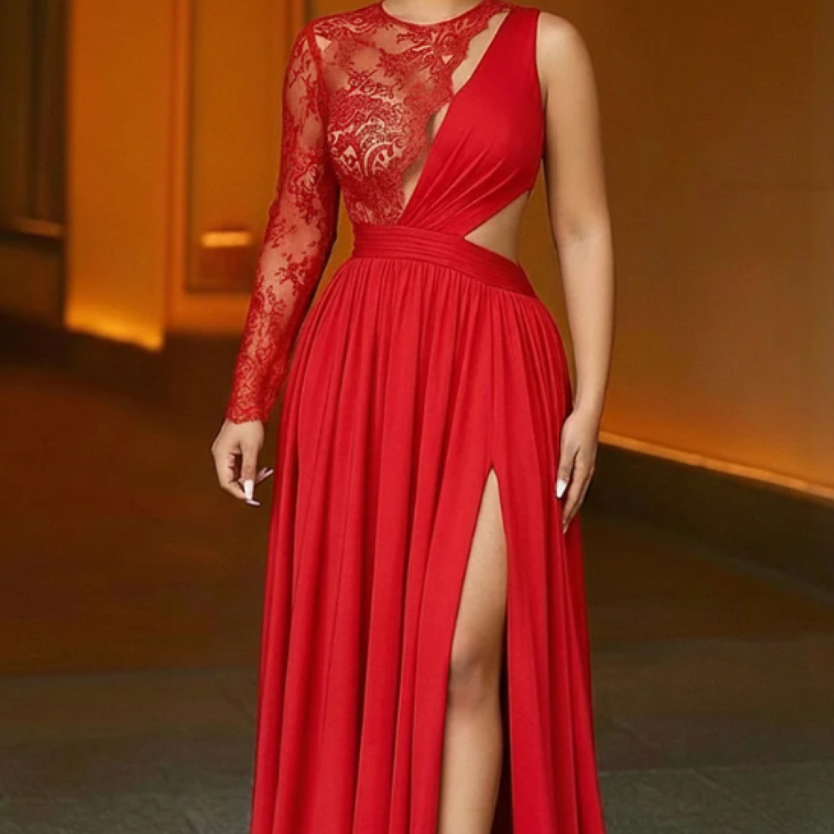 Round Neck Lace Patchwork Cut Out Slit Party Maxi Dresses-Red