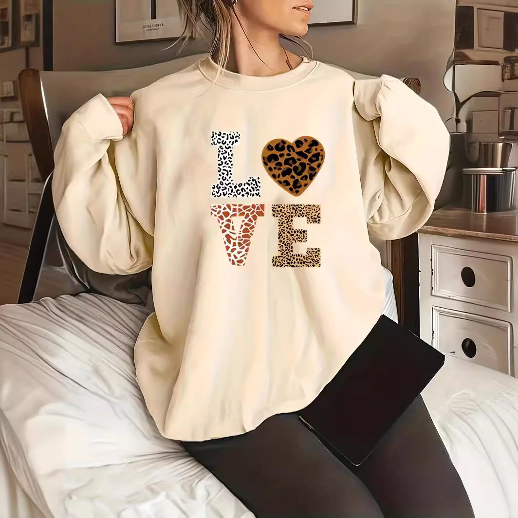 Round Neck Leopard Print Love Plus Size Sweater For Girls