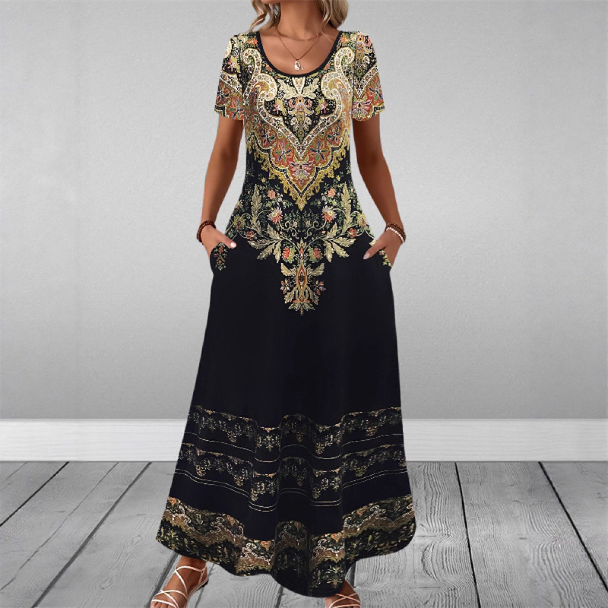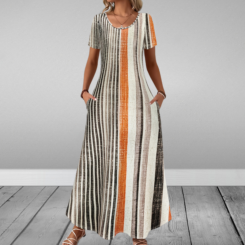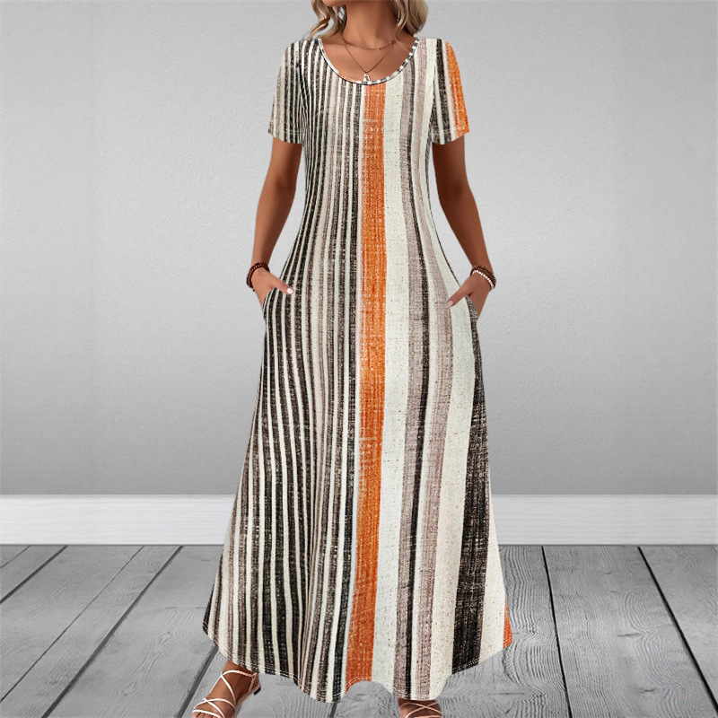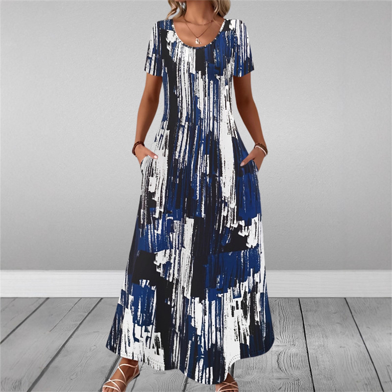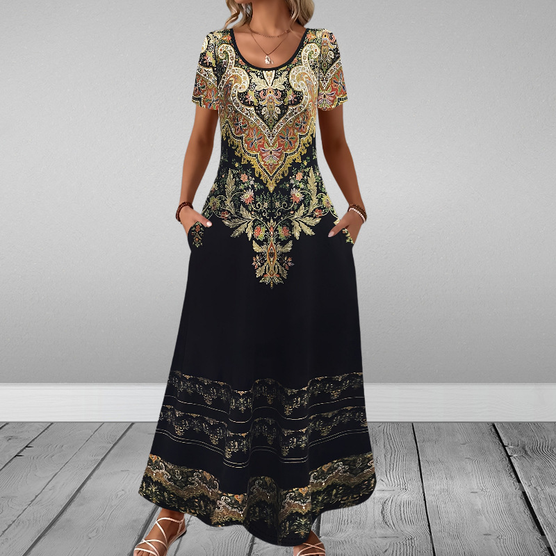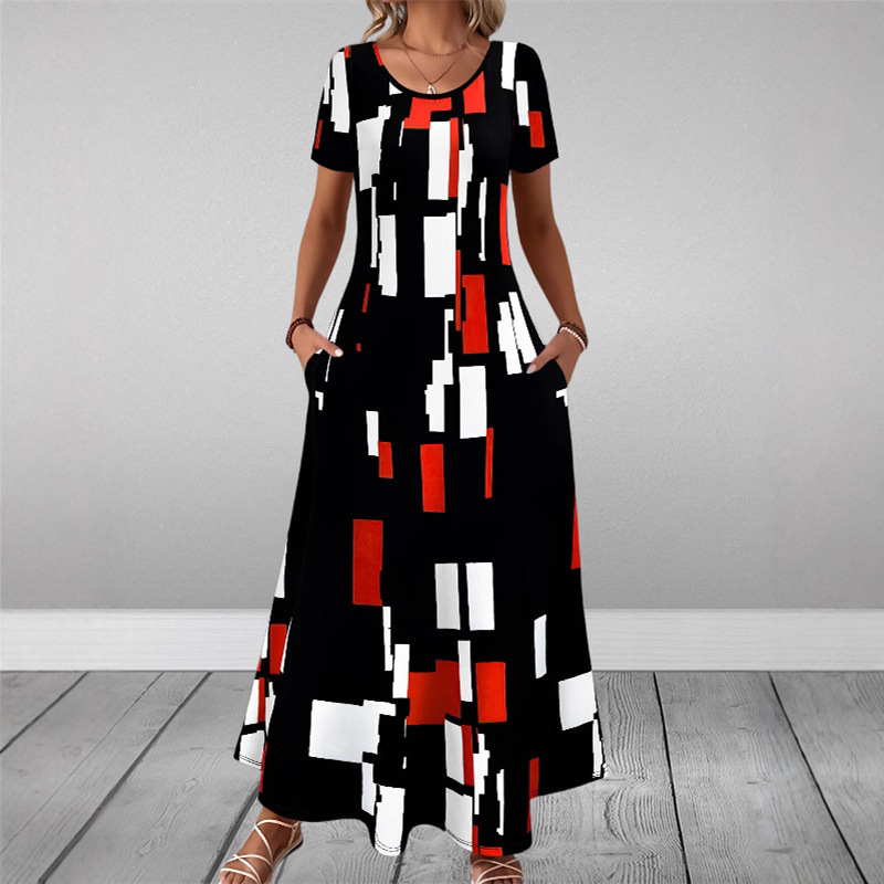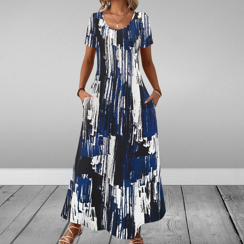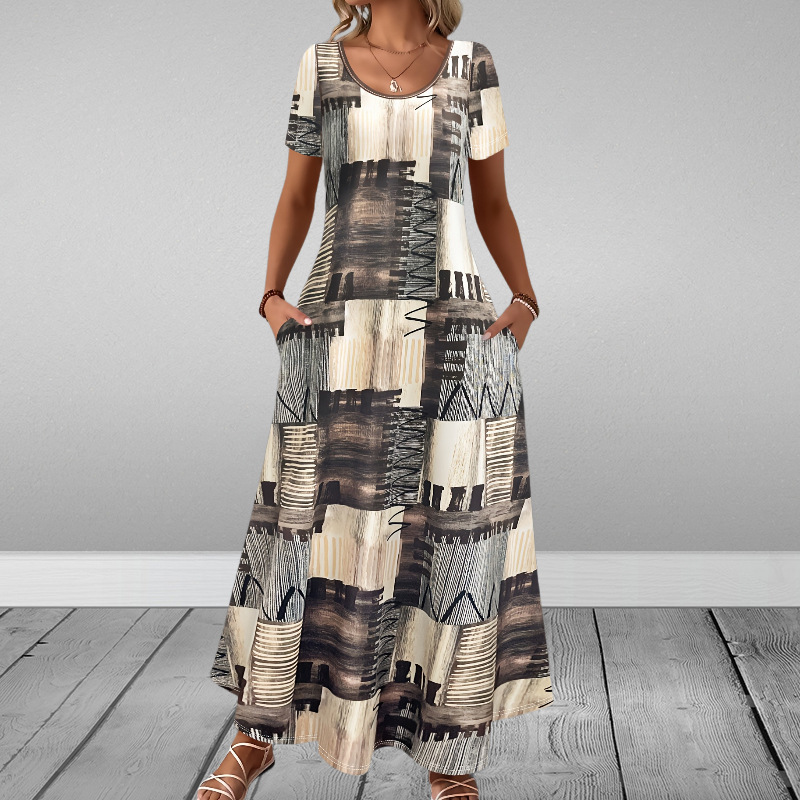 Round-neck Short-sleeve Printed Dress With Patch Pockets