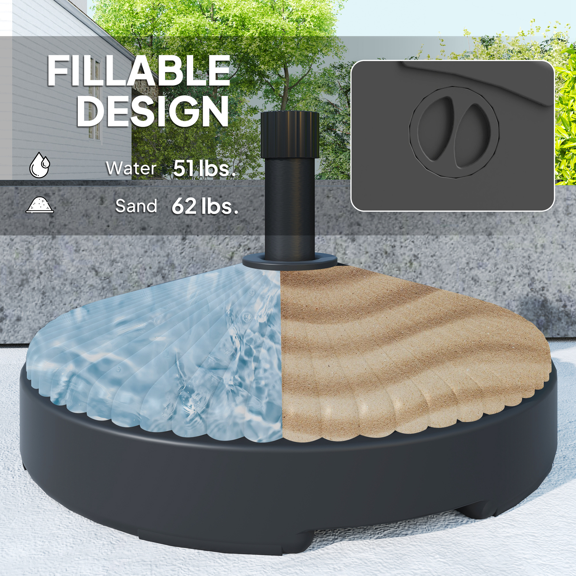 - Fillable Design: Achieve added stability with this patio umbrella base. When filled with sand, it weighs up to 62 lbs; choose water for easy handling, with a filled weight of 51 lbs. The choice is yours—sand for more weight, water for easier portability