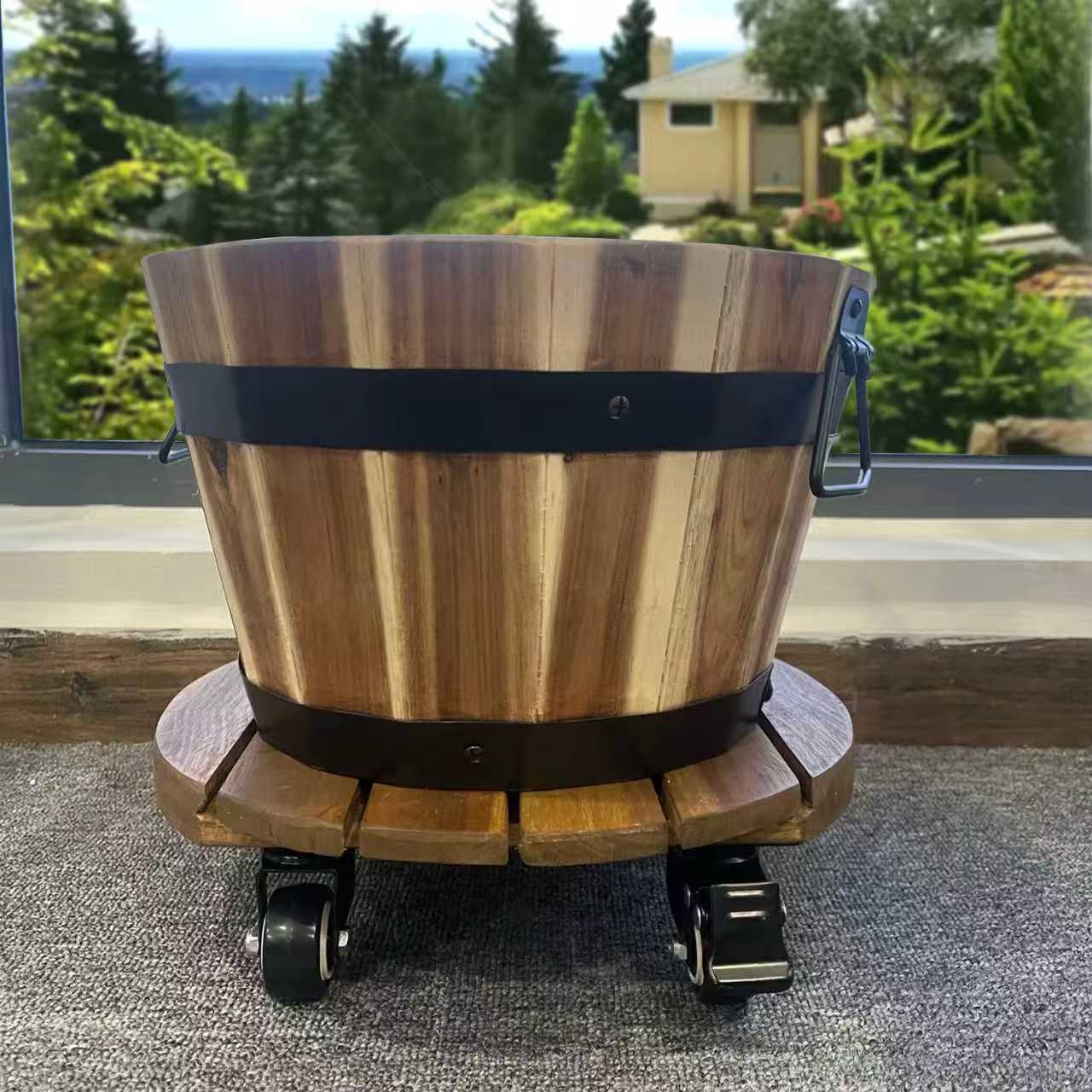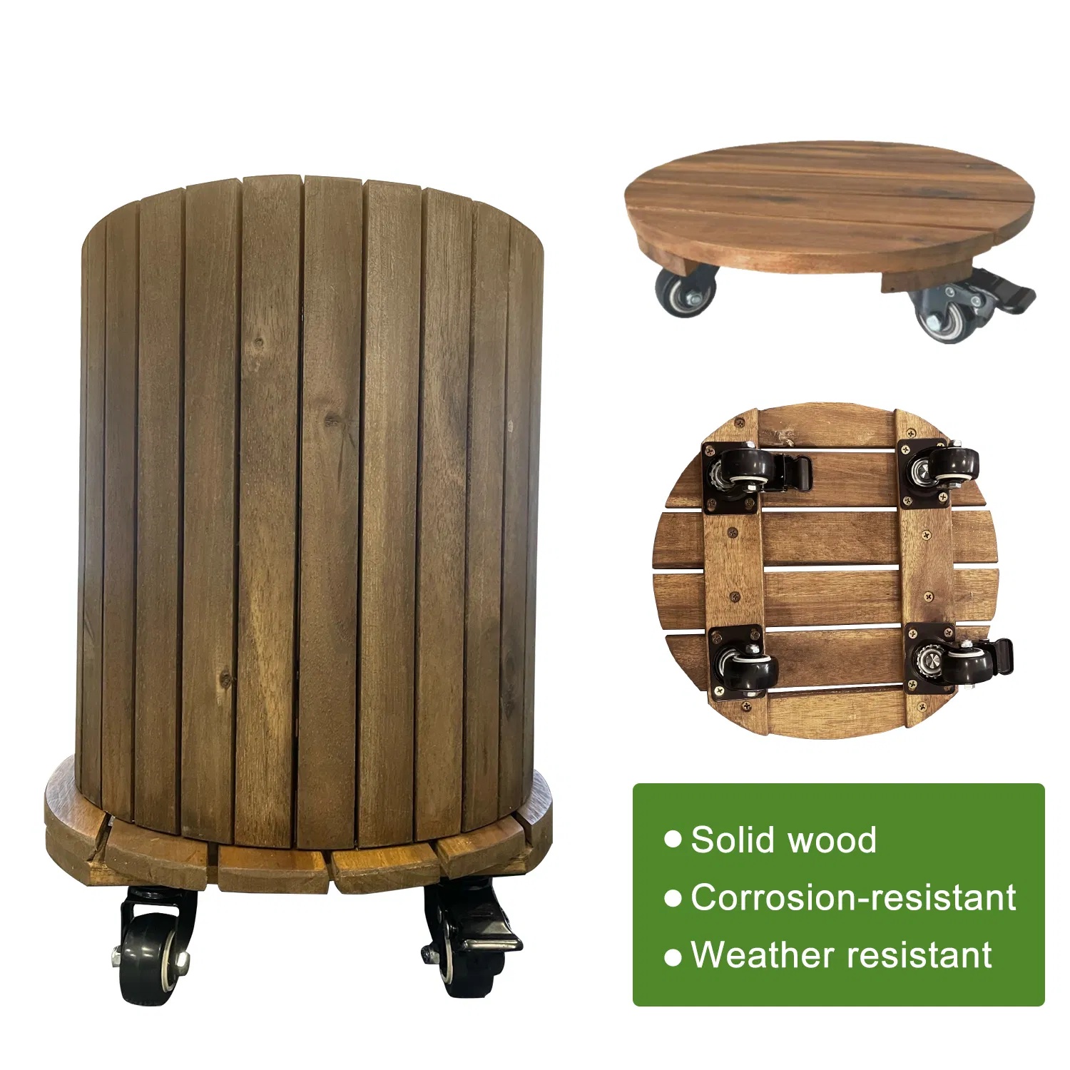 This round wooden plant caddy features 360° locking wheels, 12-inch diameter, making plant movement and positioning easy and convenient.