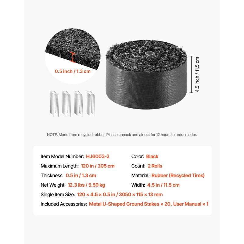 Upgraded Durable Construction: This 2-pack 120 x 4.5 in/3050 x 115 mm rubber mulch mat (0.5 in thick) is made from 100% recycled rubber fiber with green-energy adhesive. Wear-resistant, weatherproof, and reinforced with backing to avoid tearing. No special maintenance required