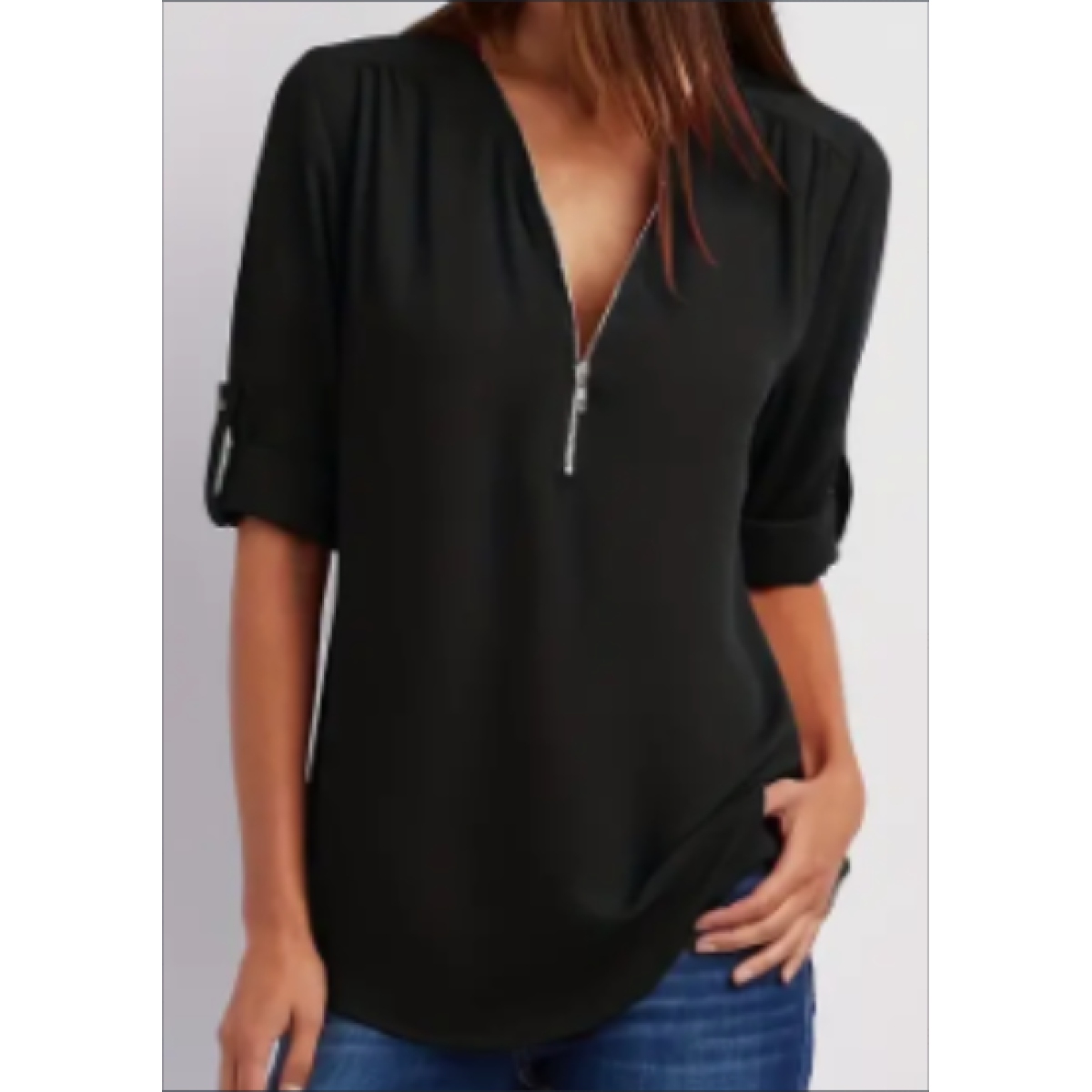 Ruched Half Zip Solid V Neck Casual Blouse, Rollable Sleeve Women's Clothing