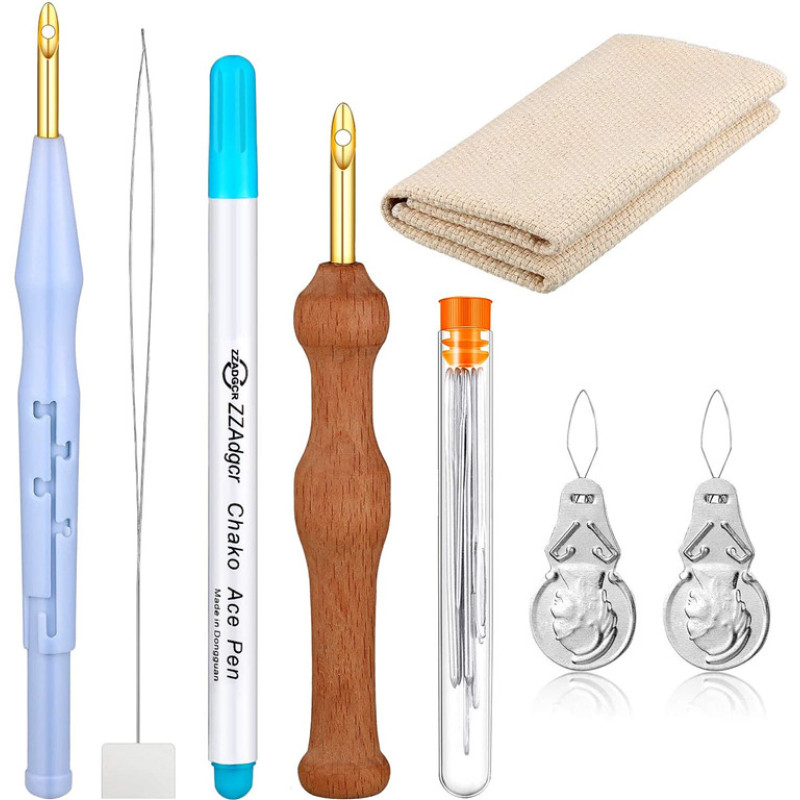 Poke needle + 2 pieces of paper threading piece +1 water erasing pen +1 wood poke needle +1 needle bottle +1 scissors + 2 old head threaders + 10 mark buckles + 2 pieces of cotton and linen embroidery cloth 28*28CM+2 embroidery circles