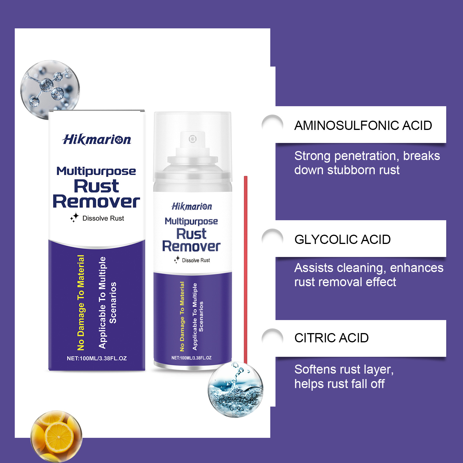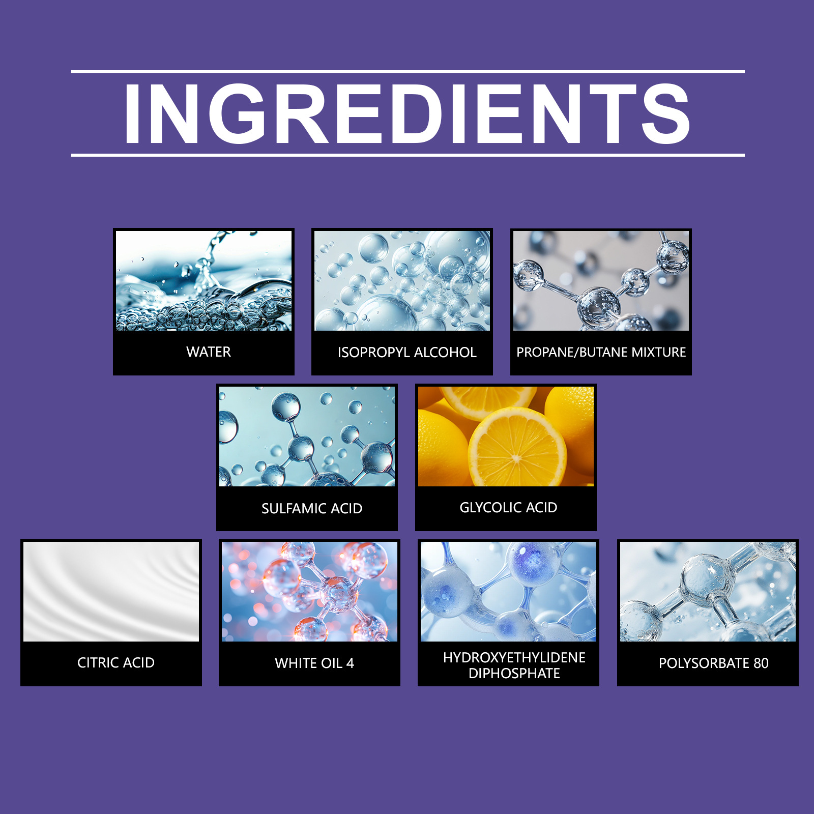 Ingredients: water, isopropanol, propane/butane mixed propellant gas, sulfamic acid, glycolic acid, citric acid, white oil 4, hydroxyethylidene diphosphate, polysorbate -80.