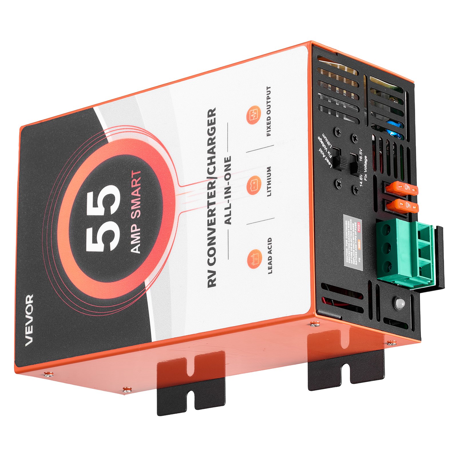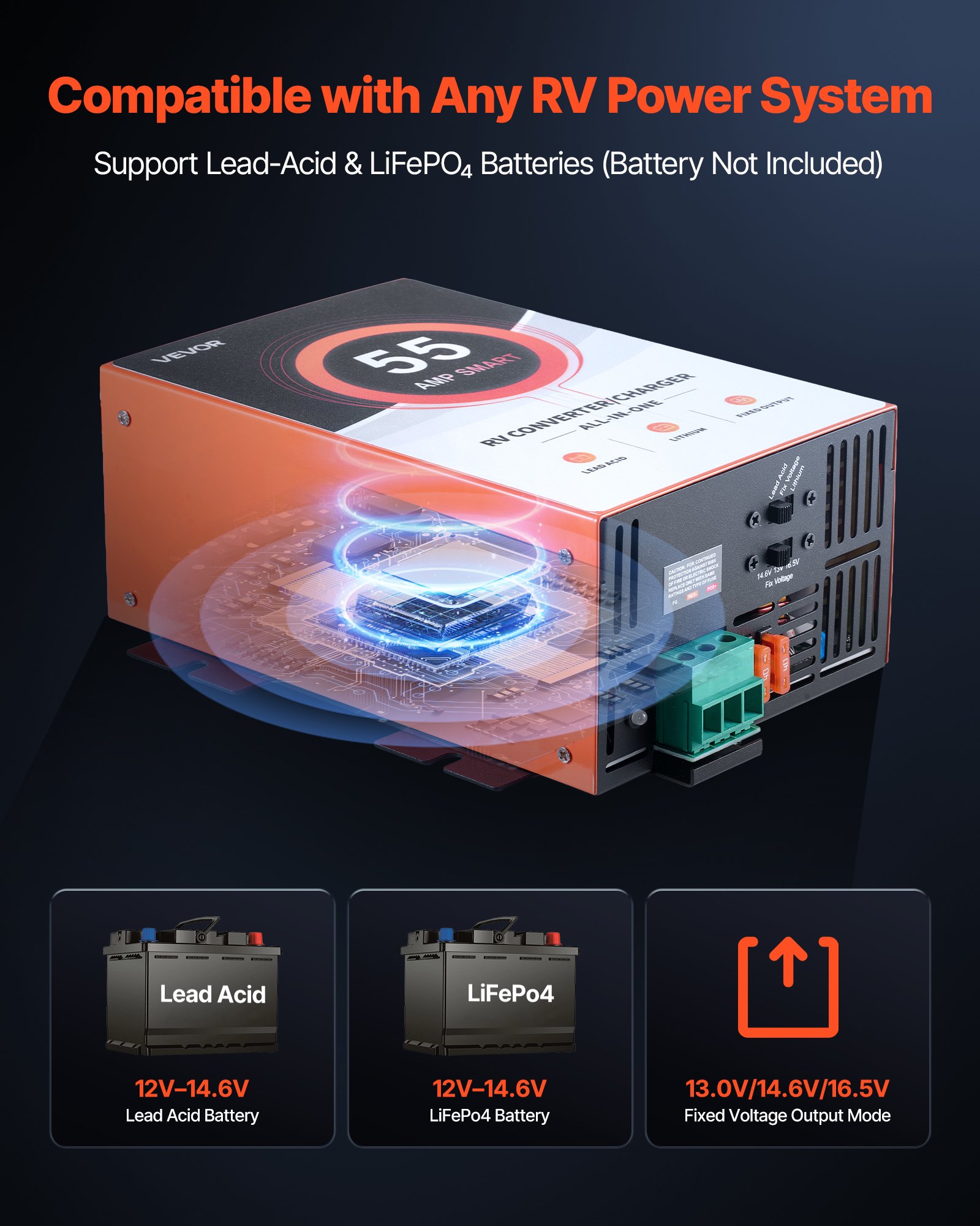 55 Amp High Performance: Delivers up to 55A clean and consistent current. Our RV converter charger powers your essential RV electronics, such as lights, speakers, and more. Suitable for medium-capacity RV batteries rated 55Ah–70Ah