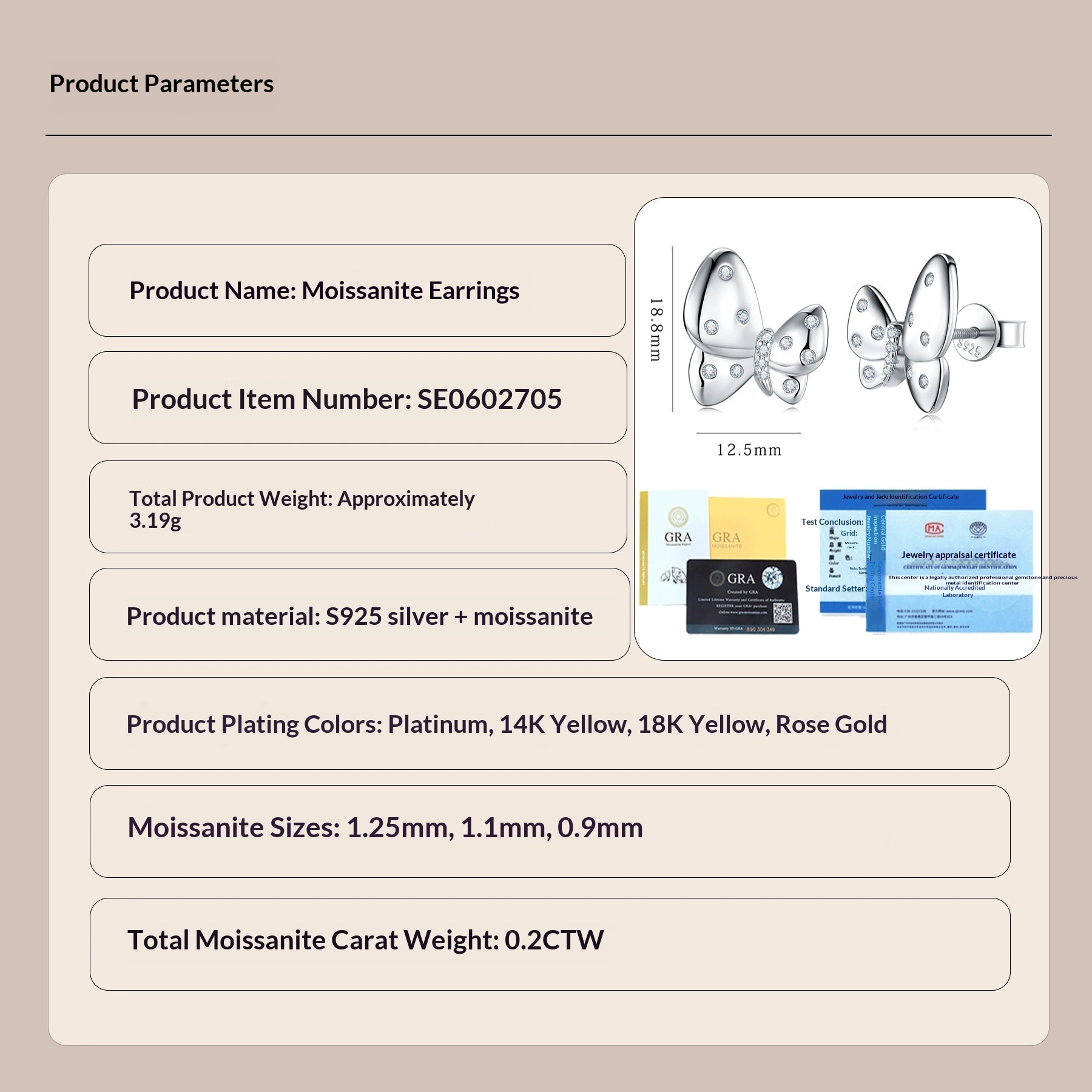 Colors: A Silver (with GRA certificate), A 14K Gold (with GRA certificate), B Silver (with GRA certificate + national certification), B 14K Gold (with GRA certificate + national certification)