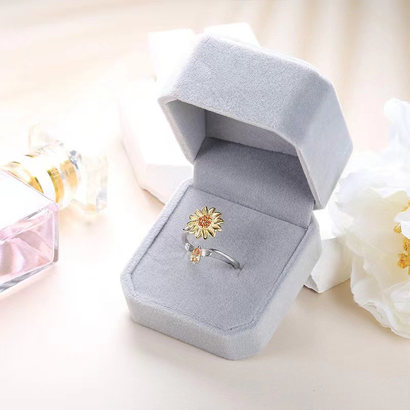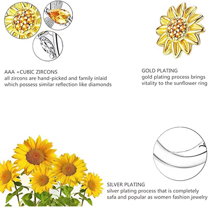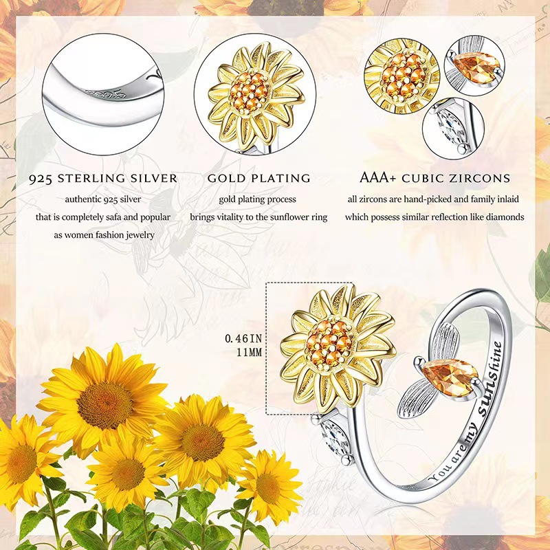S925 Silver Sunflower Rotating Ring Compression Adjustable