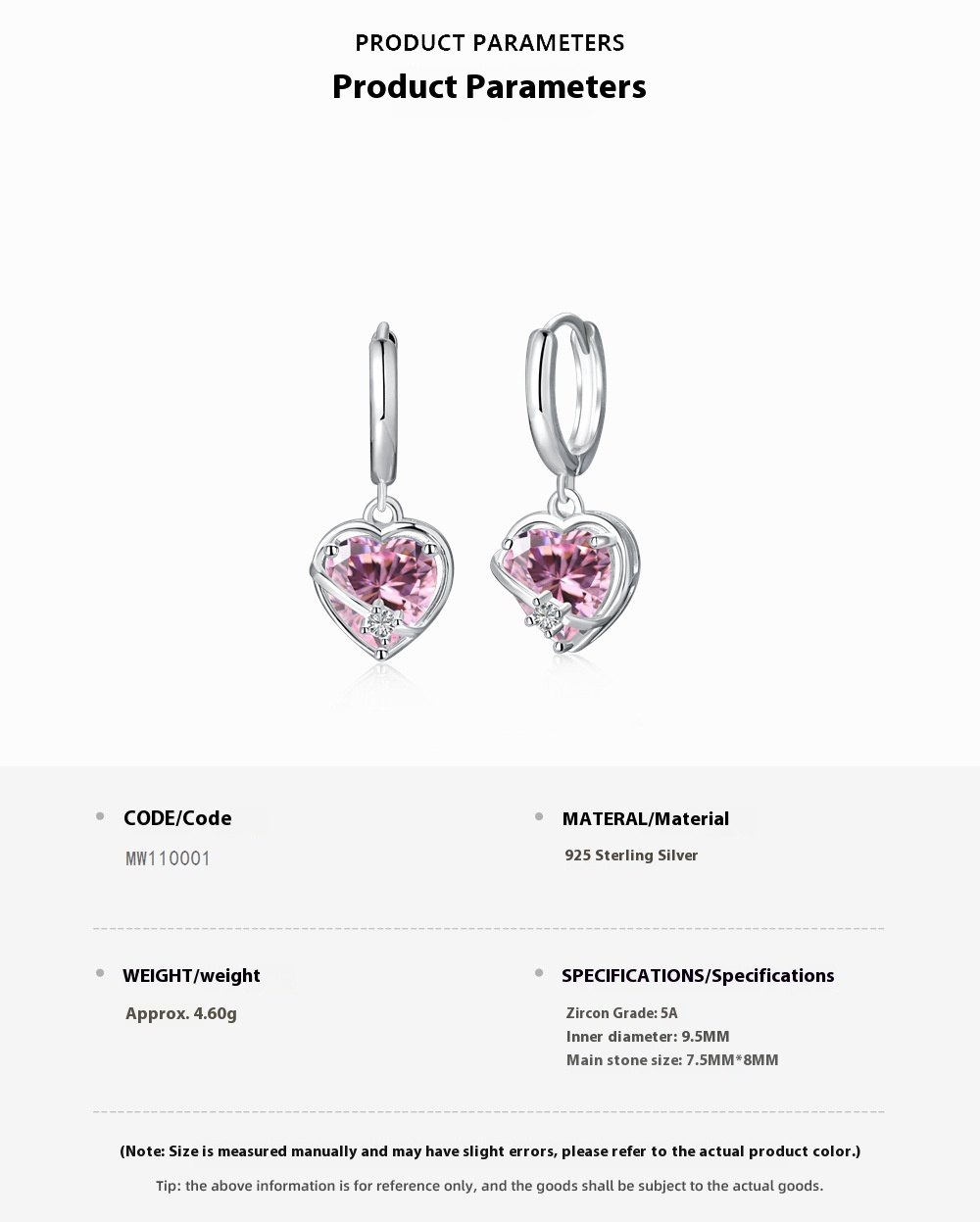 Product information:Treatment Process: Electroplating Color: MW110001-S-W-PK Material: Silver Shape: heart shape