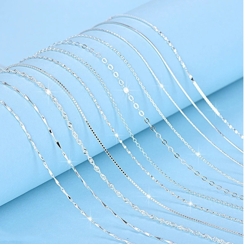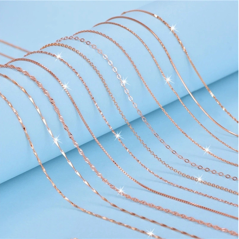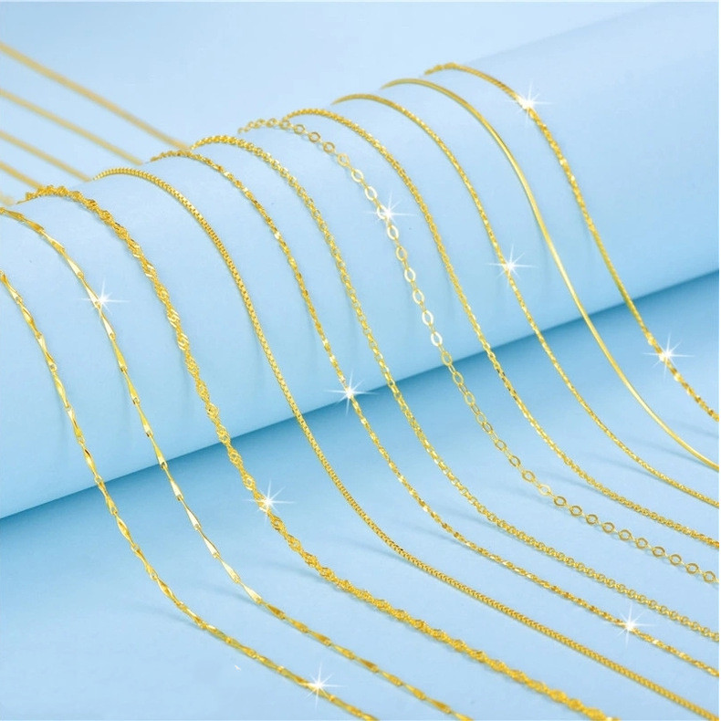 Purity: 1.0mm ingot chain 1#, 1.0mm melon seed chain 2#, 1.2mm water wave chain 3#, 1.7mm water wave chain 3#, 0.65mm box chain 4#, 0.8mm box chain 4#, 1.0mm star chain 5#, 1.2mm Calendered Cross Chain 9#, 1.75mm Calendered Cross Chain 9#, 1.0mm Car Flower Cross Chain 10#, 1.5mm Car Flower Cross Chain 10#, 0.75mm Octagonal Snake Chain 7#, 1.5mm Pearl Chain 24#, 1.0mm lateral bead Chain 18#, 1.14mm light cross chain 23#