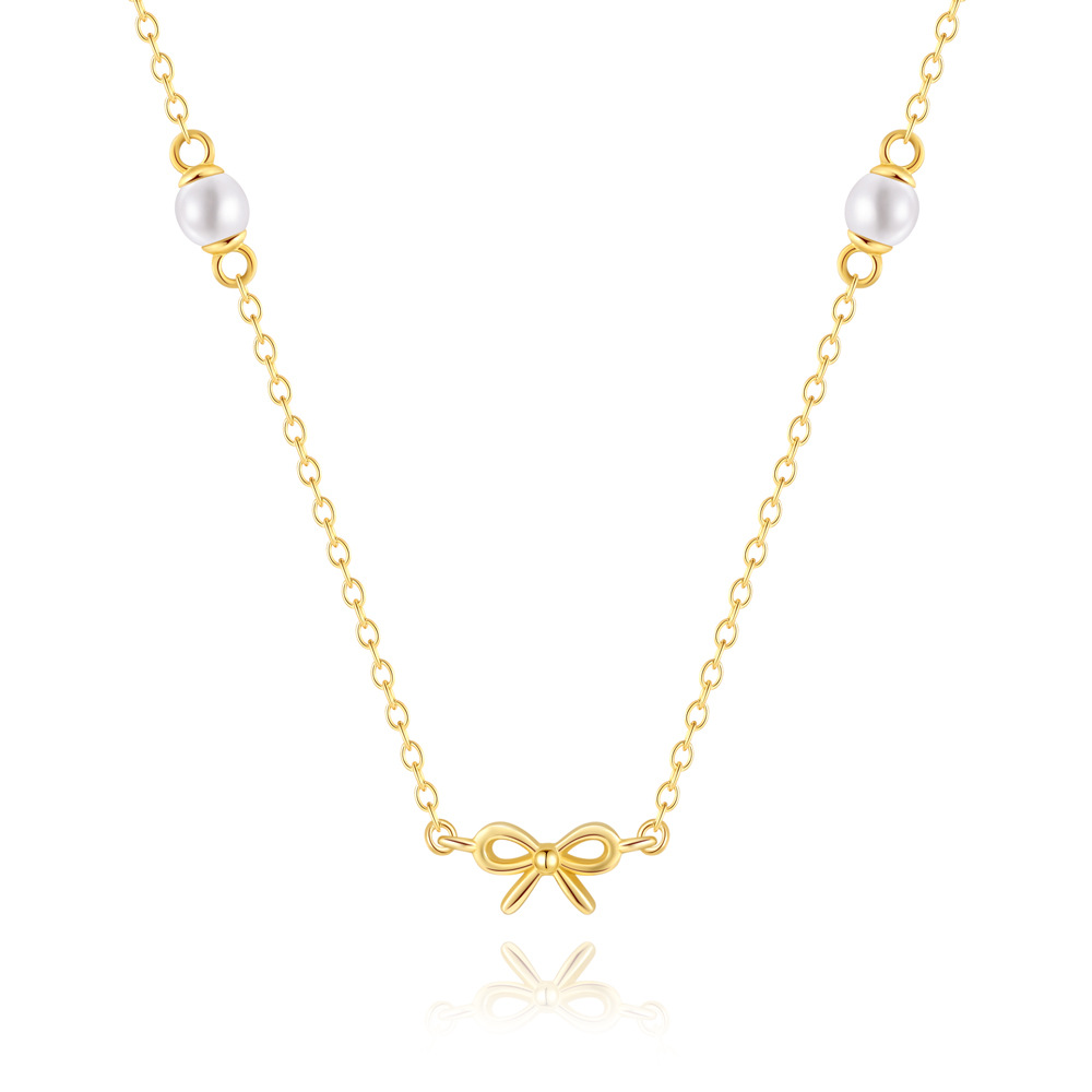 S925 Sterling Silver Simple Pearl Bow Twin Clavicle Chain Necklace