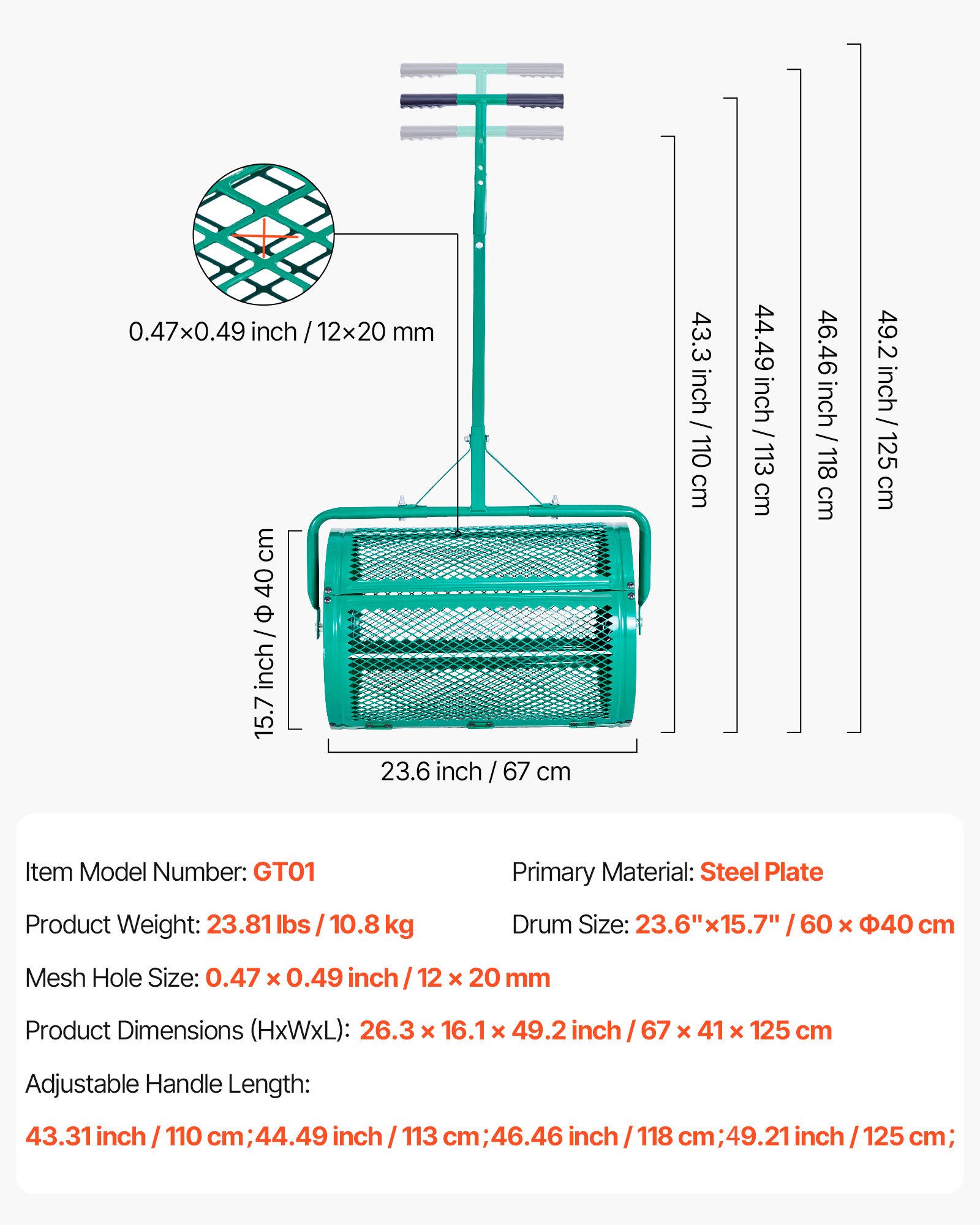 Maschenweite: 12 × 20 mm/0,47 × 0,49 Zoll, Produktgewicht: 23,81 lbs / 10,8 kg, Hauptmaterial: Stahlplatte, Trommelgröße: 60 x 40 cm/23,6 x 15,7 Zoll, Verstellbare Grifflänge: 43,31 Zoll / 110 cm, 44,49 Zoll / 113 cm, 46,46 Zoll / 118 cm, 49,21 Zoll / 125 cm,Artikelmodellnummer: GT01, Produktabmessungen (H x B x L): 67 x 41 x 125 cm/26,3 x 16,1 x 49,2 Zoll