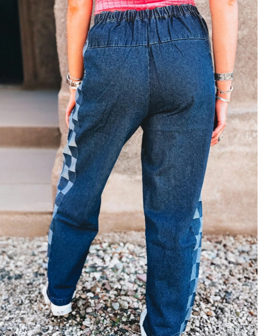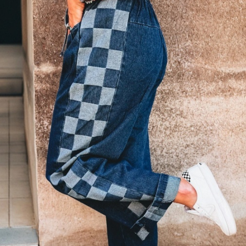 Sail Blue Checkered Side Panel Drawstring Loose Jeans