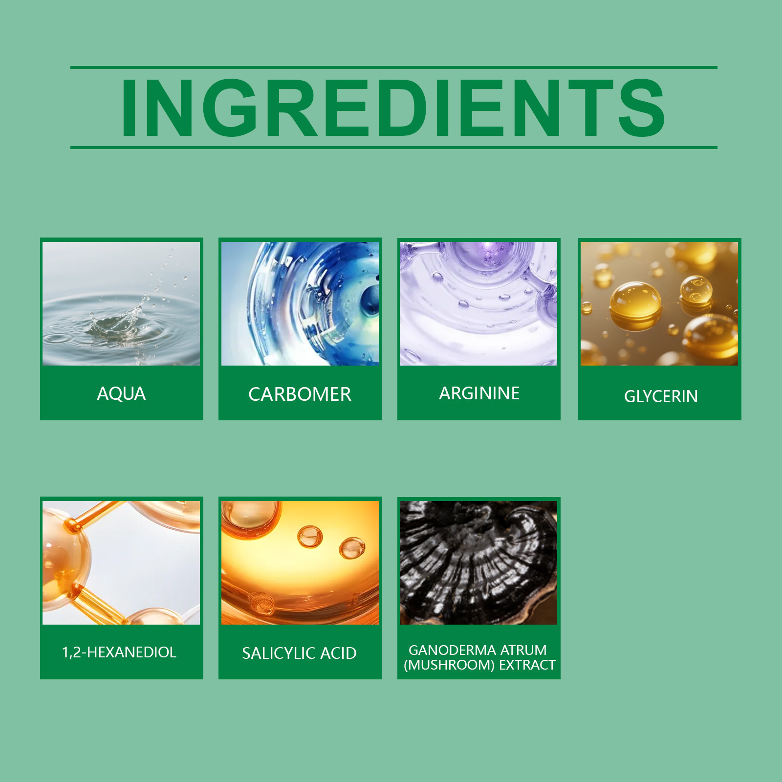 Ingredients: water, glycerin, 1,2-hexanediol, carbomer, arginine, salicylic acid, Ganoderma lucidum extract.
