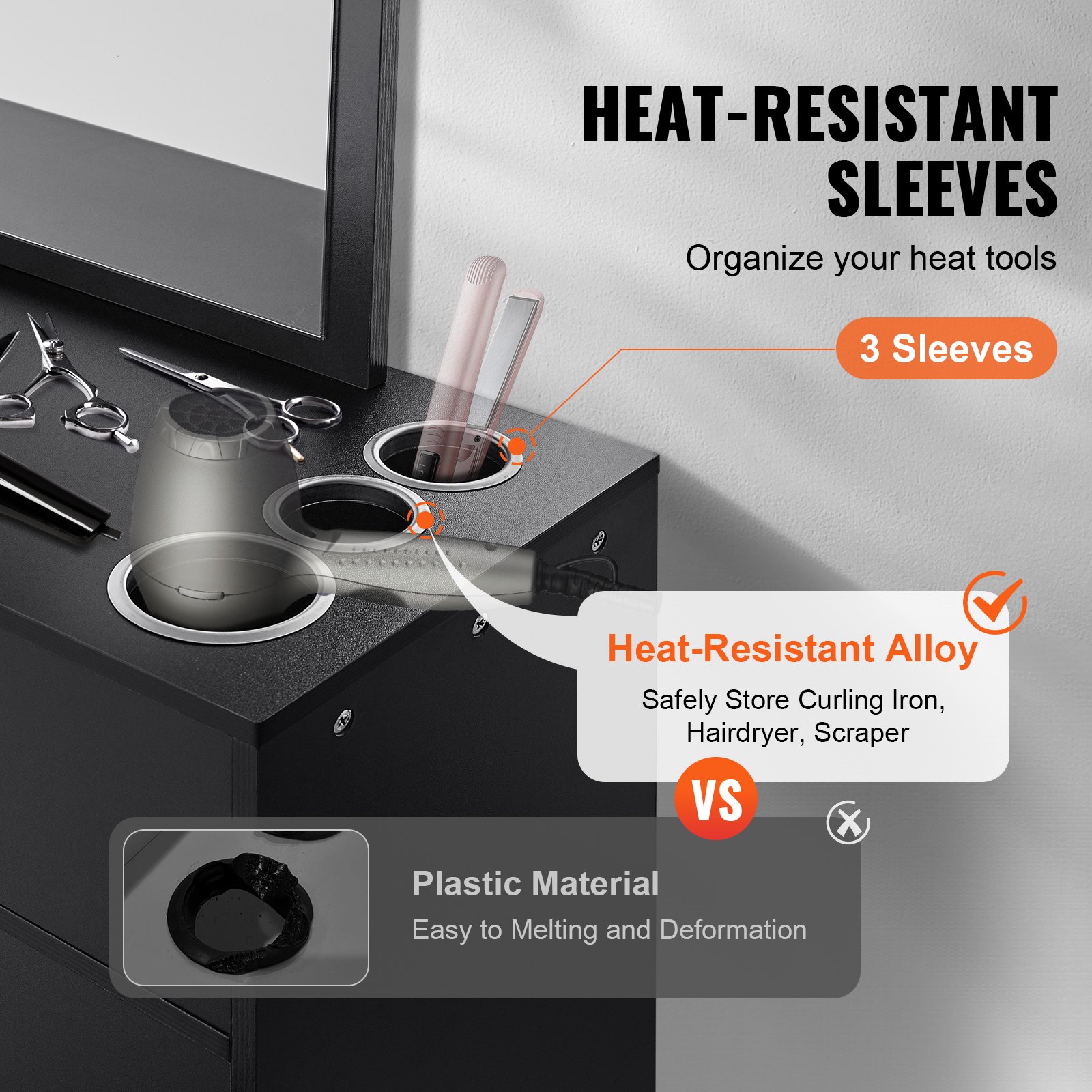 Heat-Resistant Tool Sleeves: Made of heat-resistant alloy material, the hair styling salon station provides three heat tool sleeves with a bottom cover design to prevent tools from falling, ensuring safety during use.