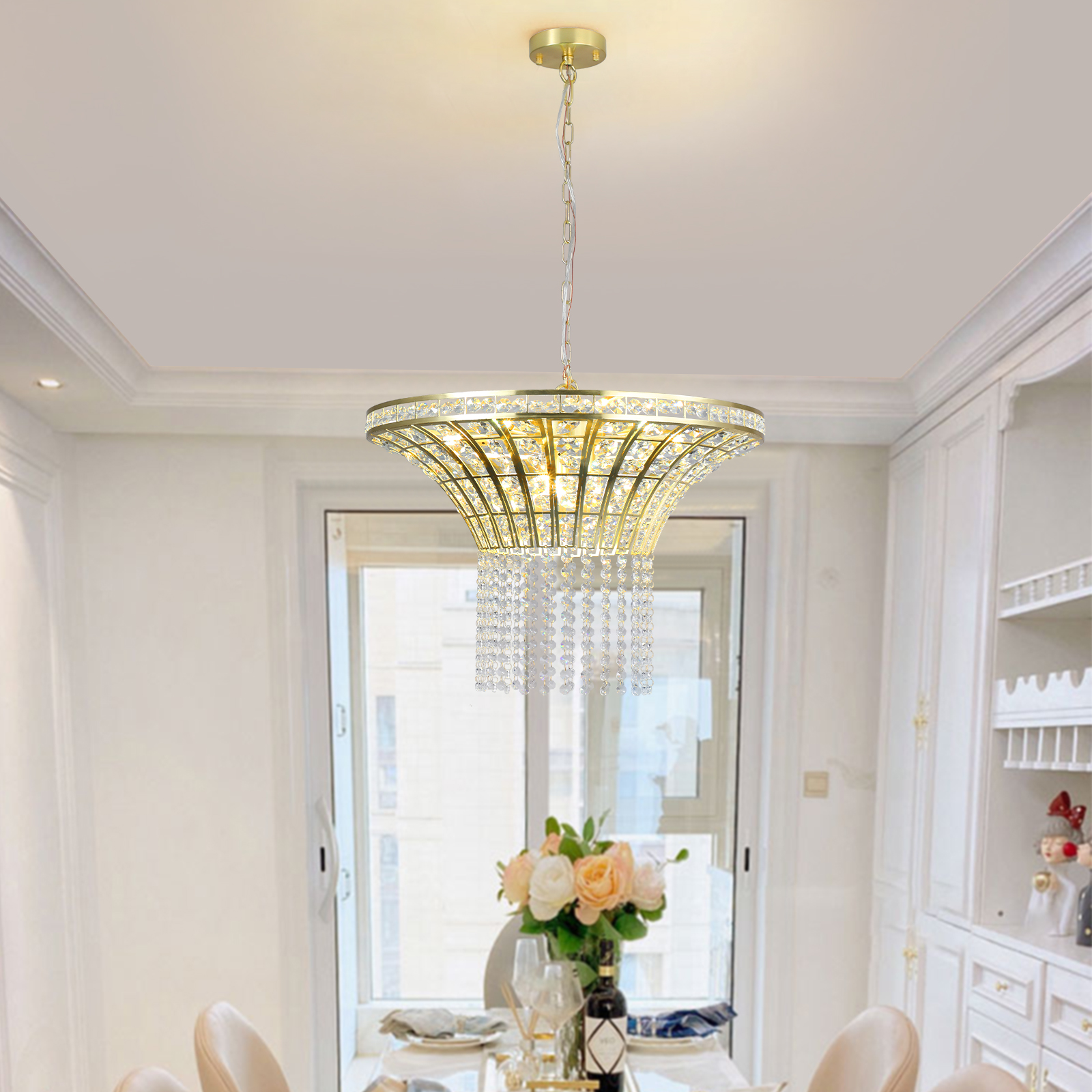 High -quality -made of unique and high -quality metal frames, it is a first -class crystal. It uses excellent technology, safety, durability, and corrosion resistance.Chandelier Size: L 23.6" x W 23.6" x Height adjustable from 59.1" to 17.7"(Adjustbale chains)High-end K9 Crystal - Made of exquisite three-dimensional octagonal bead pattern featuring crystal clear crystals that refract the light beautifully.Great light transmission - The sand gold iron lamp body crystal chandelier has the best light transmission, light can be refracted to the ceiling, making the lighting full of beauty.