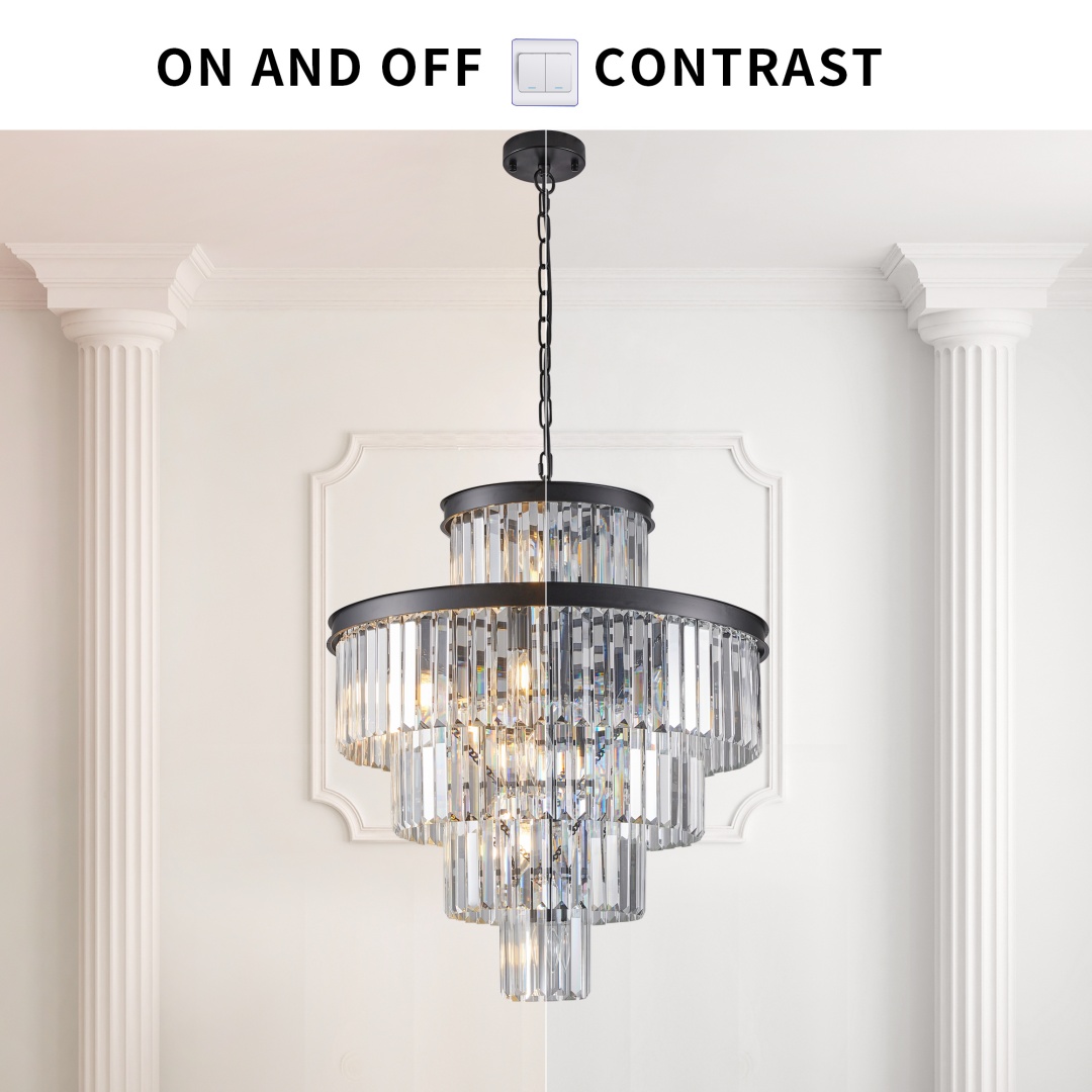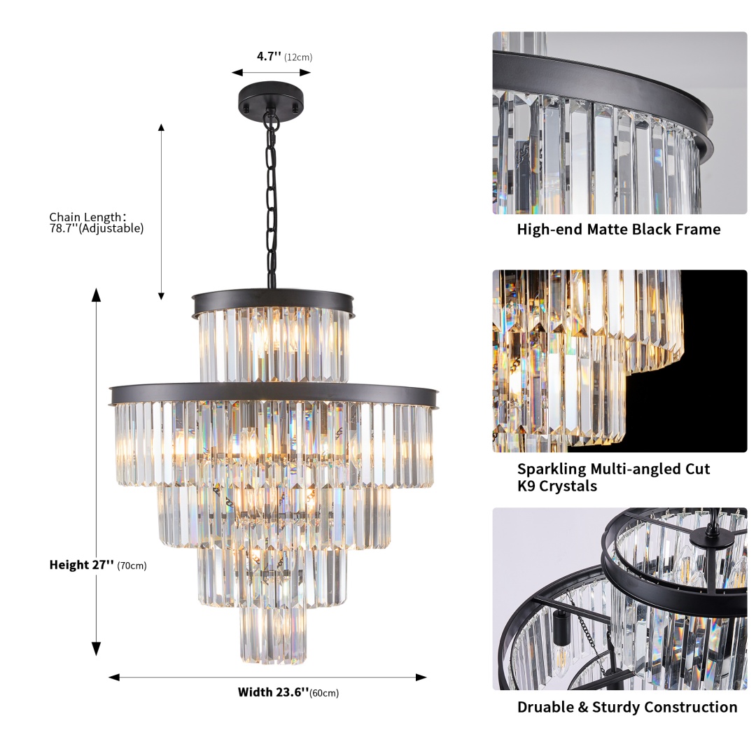 Shine Bright Like a Diamond:selected the TOP K9 crystal and the highest standards in the industry have been adopted from the manufacturing stage. Modern Crystal Chandelier with finished is a beautiful piece. With its sophisticated beauty and stunning details will fits your every space.E12 Bulb*15 Required Chandeliers: compatible with E12 LED bulb, Incandescent, energy-saving, halogen, etc. The brightness depends on the bulb you put in, if you want brighter light, please use high-watt E12 bulb(60w max),The chandelier it's compatible with dimmable bulbs and wall switch.Chandelier Light Fixture Size: Crystal chandeliers with 23.6 inches wide and 27.6 inches high. Please check the size of the chandelier lighting fixture before purchasing.Simple Assemble: Crystals come in 1 size, each crystal strand needs to be hanged one by one. When the chandelier lights up for a moment, everything is worthwhile all the effort will be transformed into your smile.Suggested Space Fit: Securely wrapped crystal high ceiling light fixture. light up your Living Room, Dining Room, Porch, Staircase, Foyer, Hallway, add some elegance to your home with this crystal chandelier ceiling light.