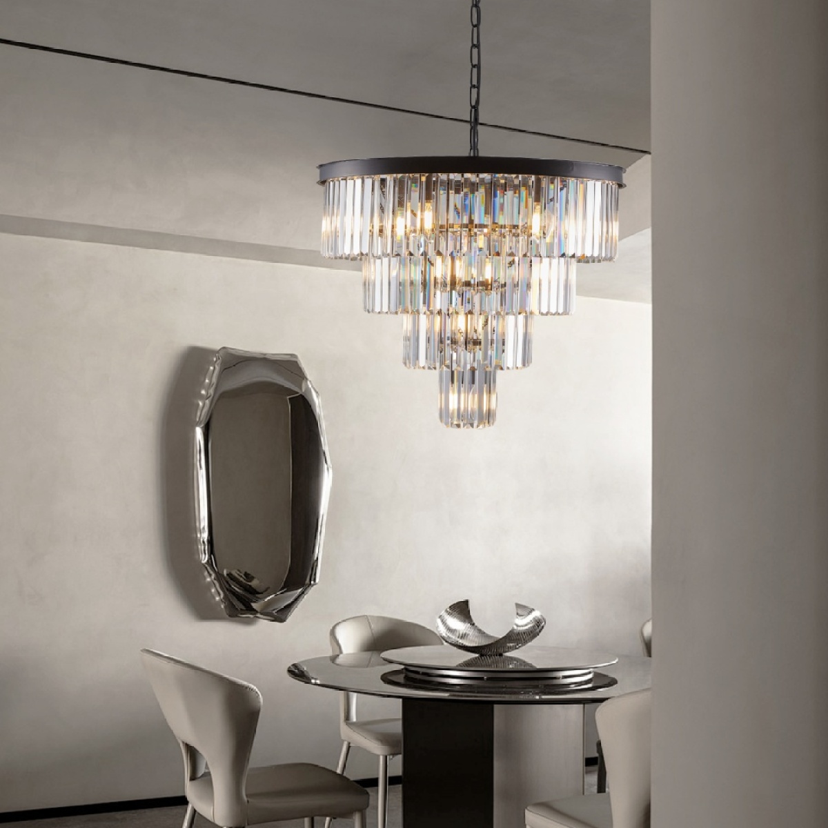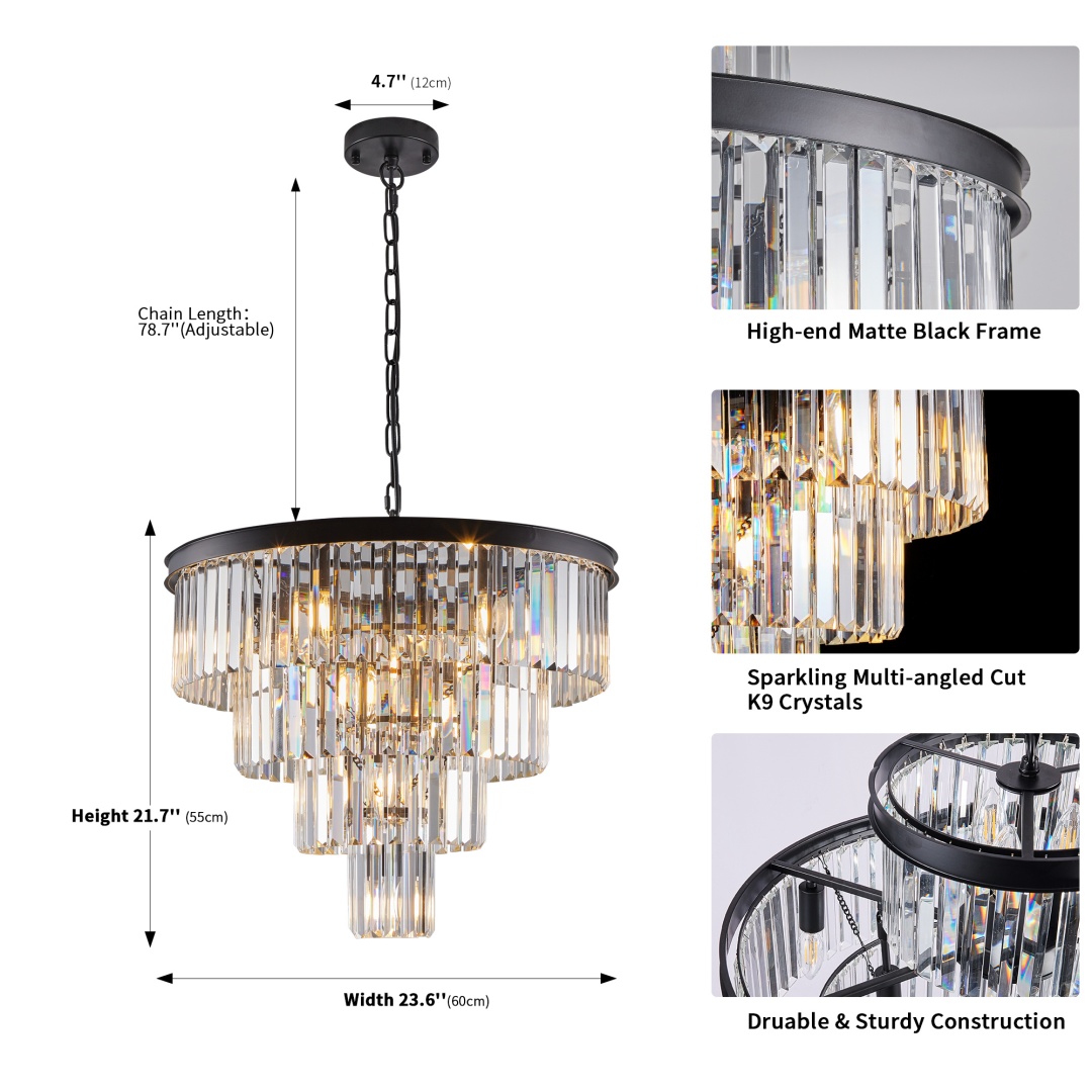 Elegant and classic design -The black crystal chandelier comes with a high-quality metal frame and K9 top-notch crystal.The overall size of modern K9 crystal chandelier is 23.60(W)×21.70(H) inch. Hanging chain is adjustable, you can change chandelier height according to your rooms height.E12 bulb base ×12 (bulb not included), compatible with energy saving, halogen bulbs etc. Maximum 60W Per Bulb.Applicable scenarios -This ceiling light fixture could light up your room extremely and widely to create a superior and classy atmosphere in your living room, dining room and bedroom,etc.