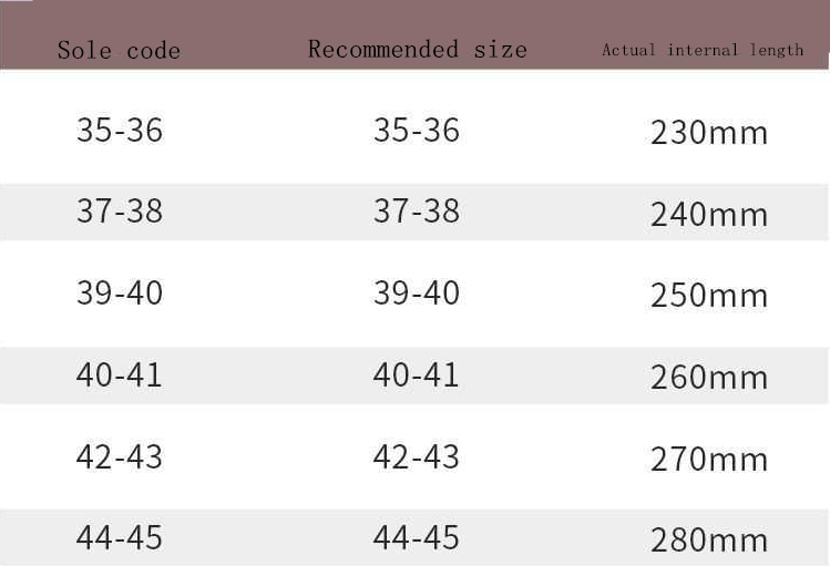 Size: 35-36 (recommended 35-36), 37-38 (recommended 37-38), 39-40 (recommended 39-40), 40-41 (recommended 40-41), 42-43 (recommended 42-43 ), 44-45 (recommendation 44-45), 46-47 (recommendation 46-47)